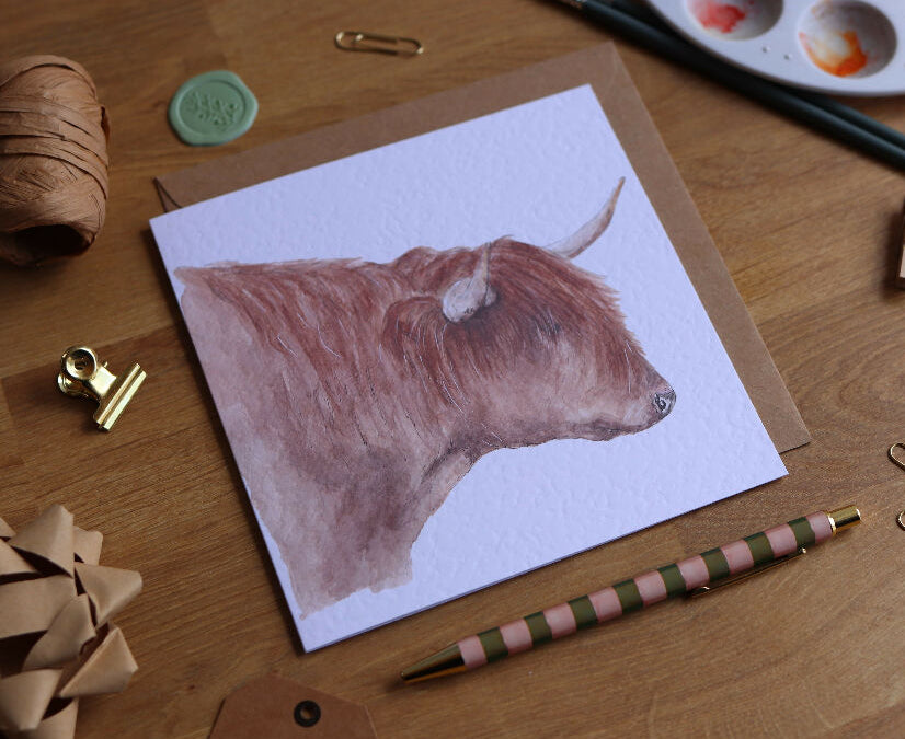 Featuring a watercolour illustration of a highland cow. Why not create the perfect gift and pair it with a matching keyring or coaster.