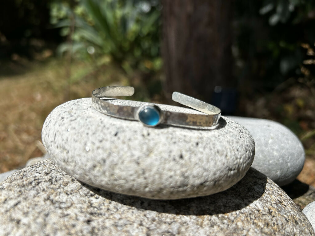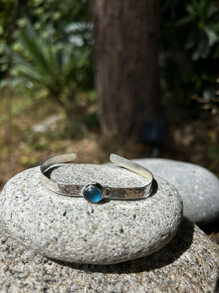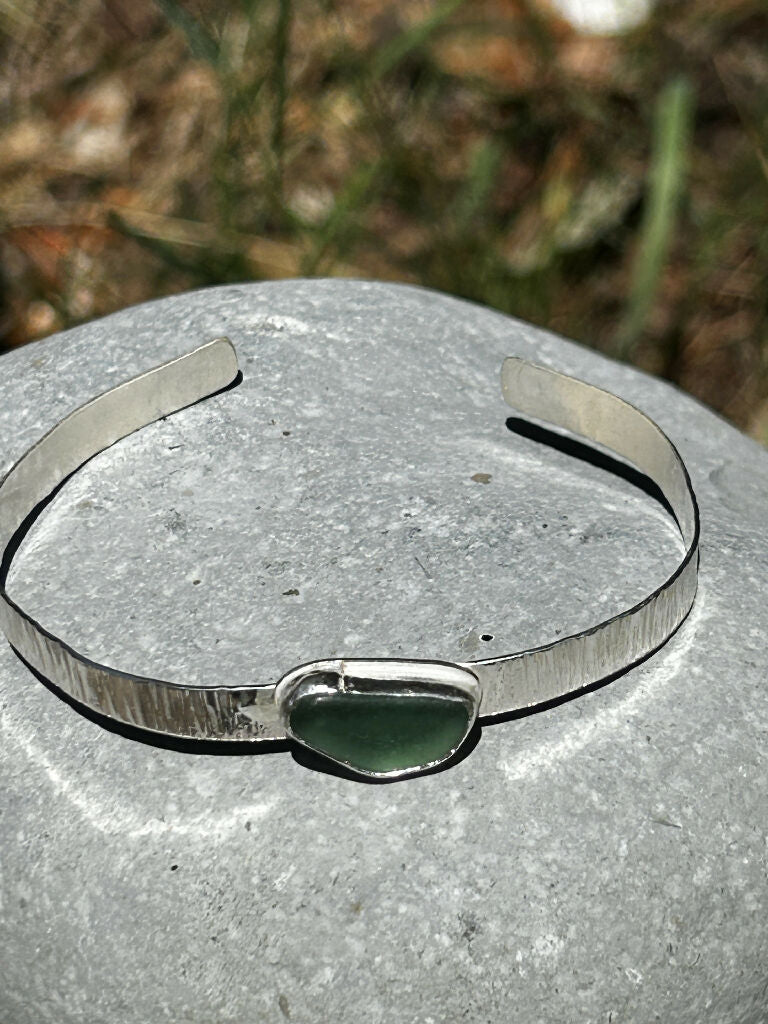 seaglass set by hand in a silver bezel setting. Hand soldered and fitted to the hand formed bangle cuff. the silver cuff after being shaped has been textured to capture a sparkle of light as it’s worn. hallmarked by the London assay office with Sophie’s unique hallmark’SEA’
