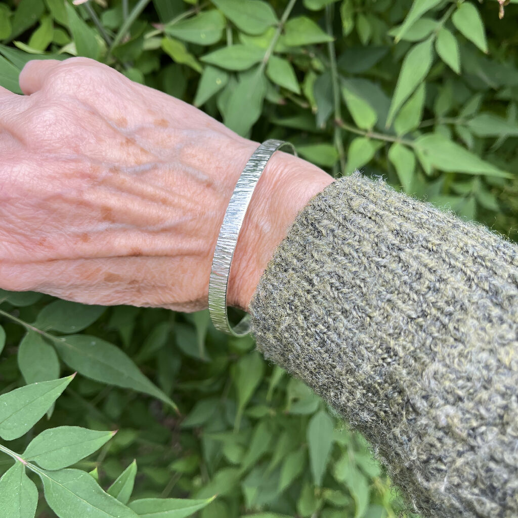 The bangle has a contemporary modern look, and is made using solid 925 sterling silver, finished with a striking hammered finish. Hand-crafted in my West Yorkshire workshop, you will love how it looks and feels on your wrist.