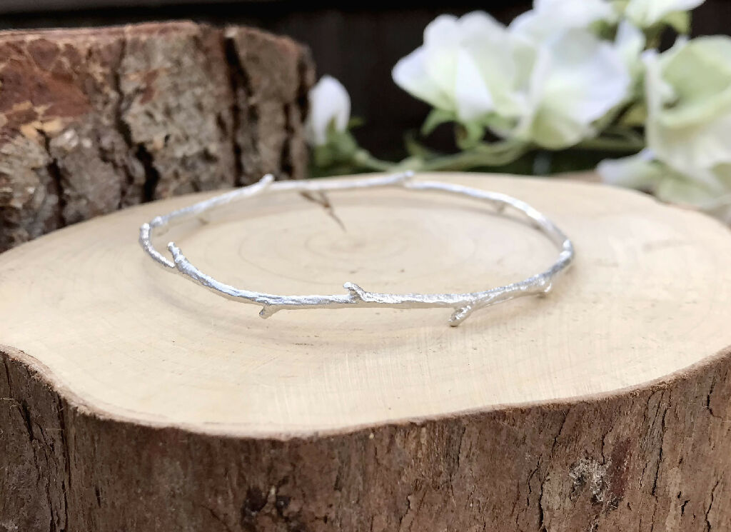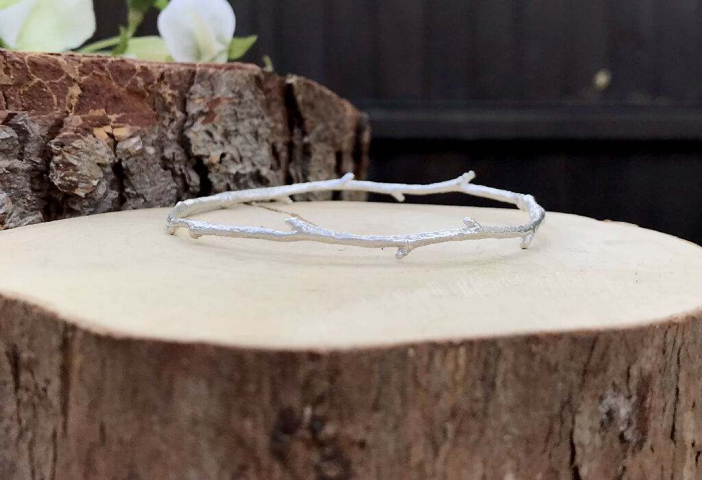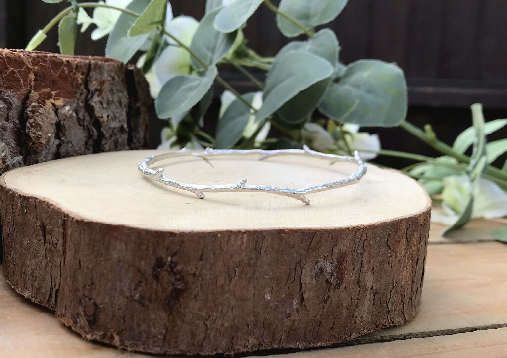 Unusual and striking, this Narrow Silver Twig Bangle is handcrafted from a real natural twig. Using the ancient technique of Lost Wax Casting, the twig is transformed into .925 sterling silver, capturing every natural texture and detail, and then carefully shaped into an elegant, organic bangle.