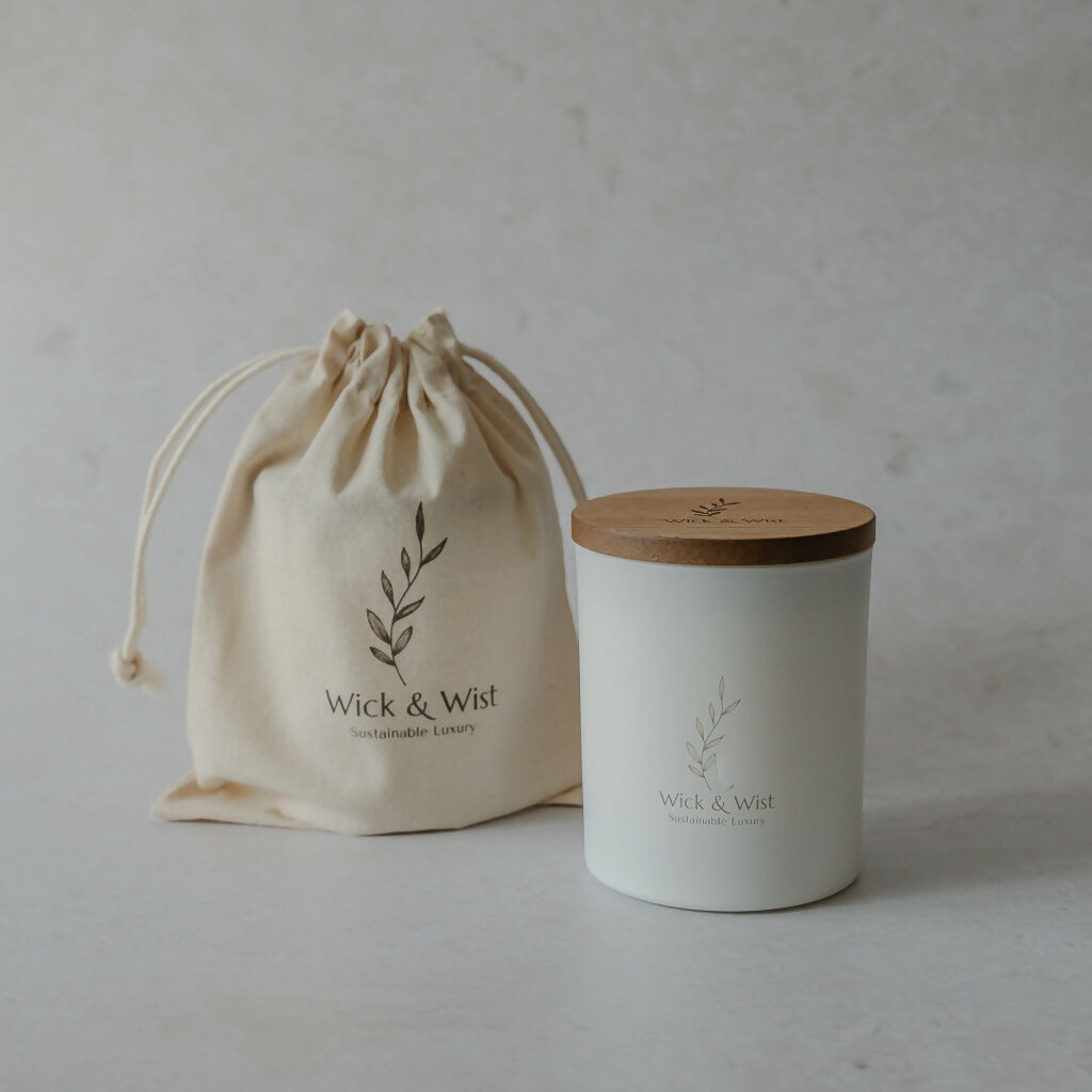 Every candle is meticulously nestled in a reusable GOTS certified cotton drawstring pouch, ensuring a delightful unboxing experience for yourself or for gifting.