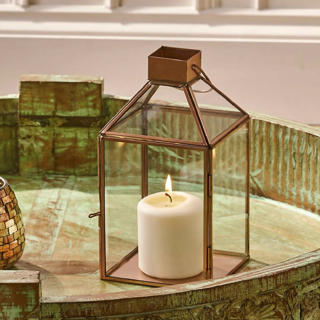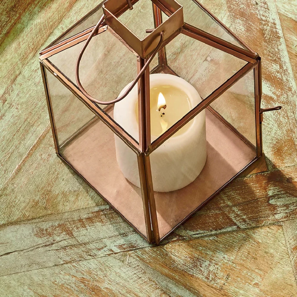 In a charming shape, this candle holder radiates elegance. Featuring a metal frame with a copper colour finish. The sophisticated glass panels let the candlelight shine through the whole room, while the metal frame creates enchanting shadows.