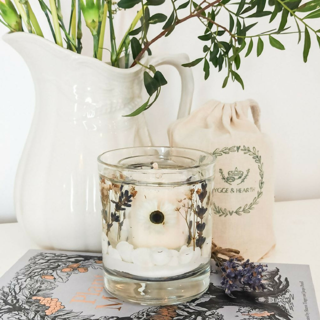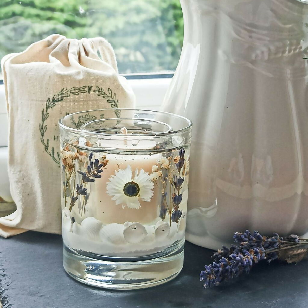 Handcrafted to order using seashells on a bed of white sand with decorative daisies, sprigs of lavender and gypsophelia providing a cottage garden feel. The botanics are suspended in a soft clear gel wax, with a pure soy wax scented votive candle (burn time of 16 hours approx) sitting centrally, allowing this soy and gel wax candle to be reused - suitable for use with a tealight. Vegan and cruelty free.