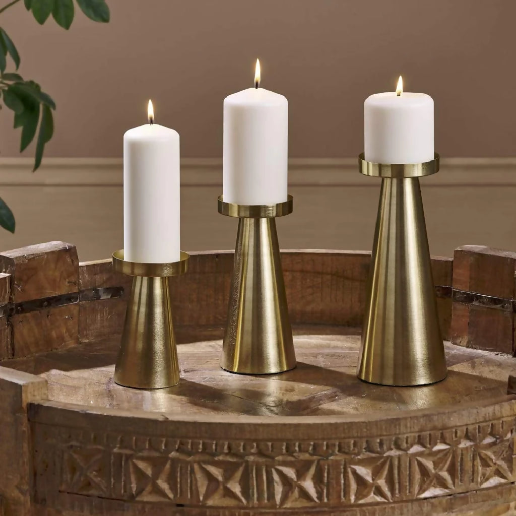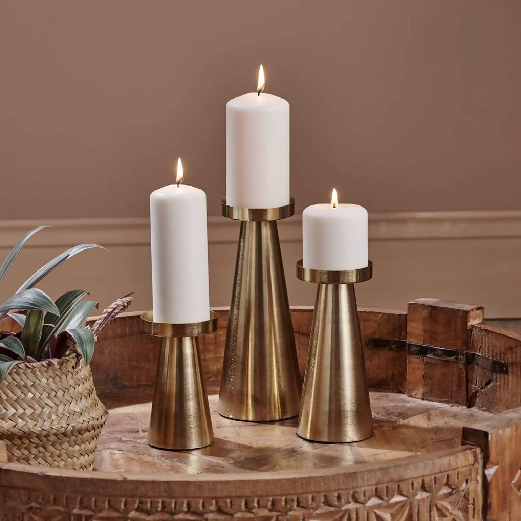 Introducing our exquisite Golden Metal Pillar Candle Holders for both indoor and outdoor – a perfect blend of elegance and functionality to elevate your home decor. The heavy base ensures a sturdy foundation, preventing accidental toppling and providing peace of mind during candle-lit moments. Available in 3 sizes, allowing you the flexibility to create a visually stunning arrangement.