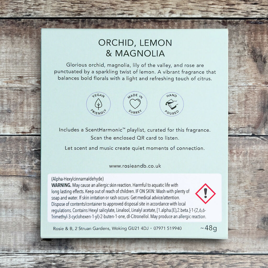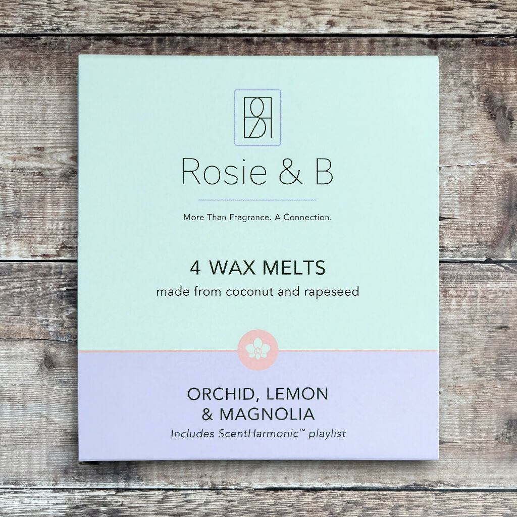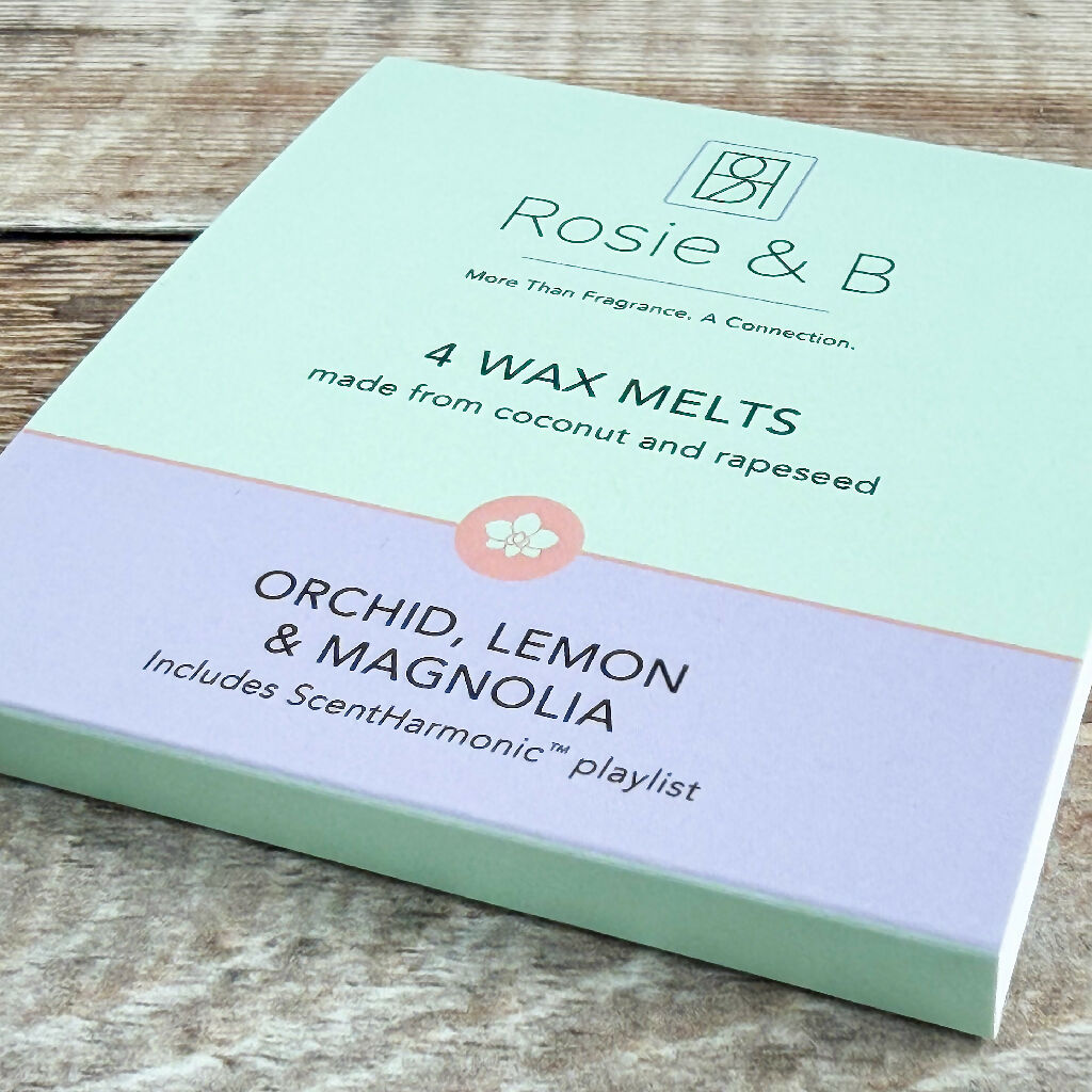 A packet of 4 Orchid, Lemon & Magnolia wax melts on a wooden background