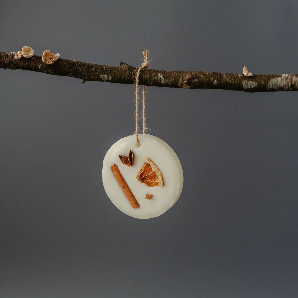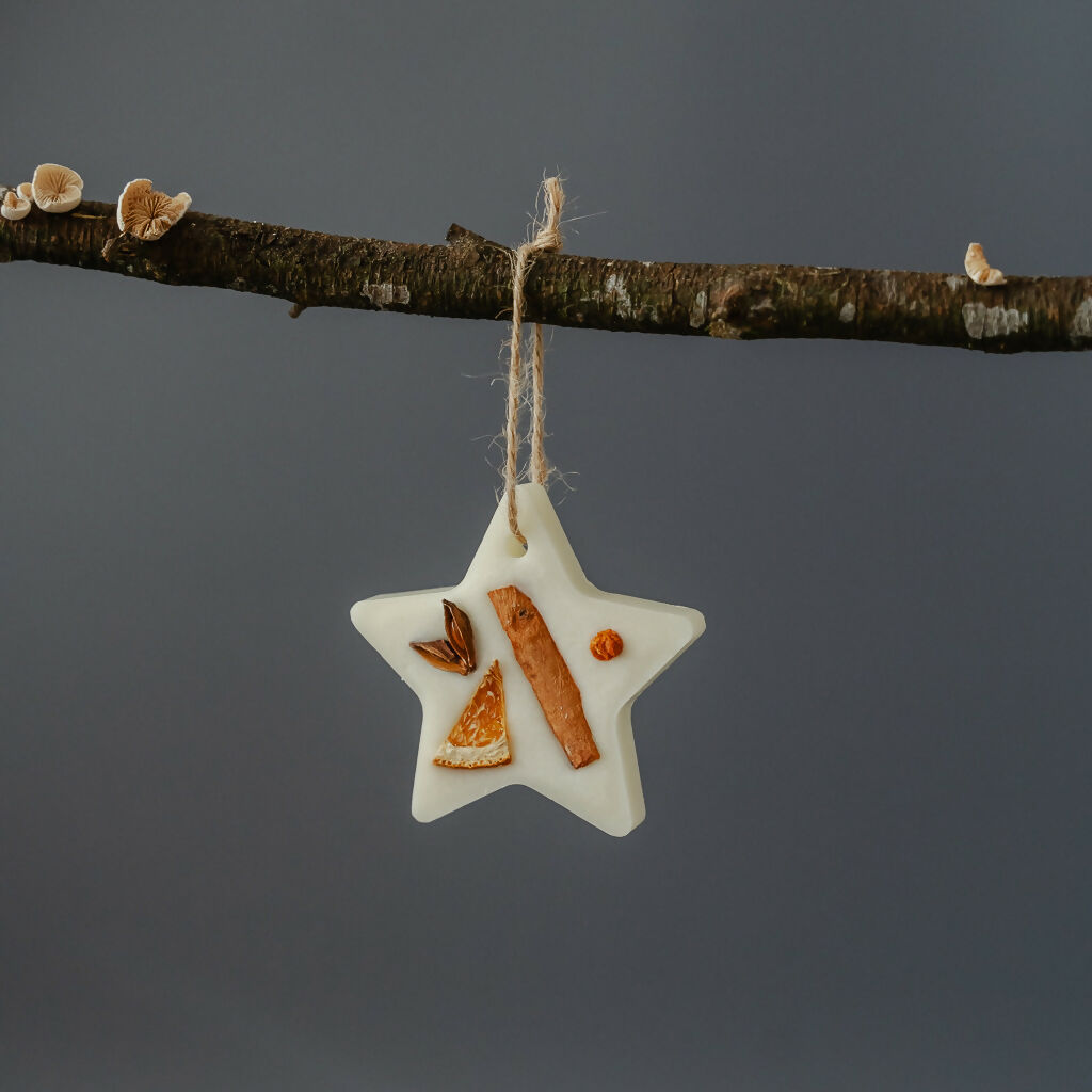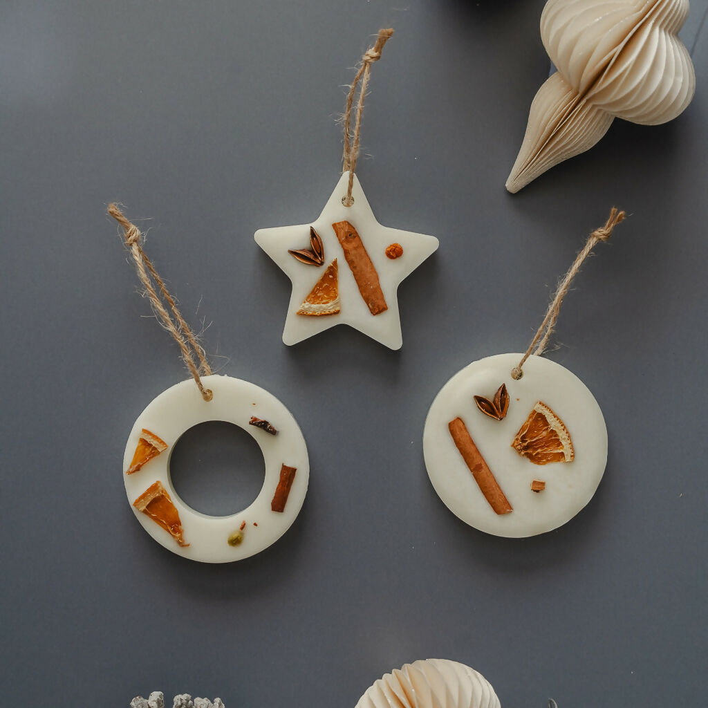 Set of 3 Scented Christmas Tree Decorations in our signature No. 08 Winter Spice Fragrance. The set includes 3 decorations (1 star, 1 round and 1 wreath) that have been beautifully handmade from our all natural coconut and rapeseed wax and decorated with dried festive botanicals.