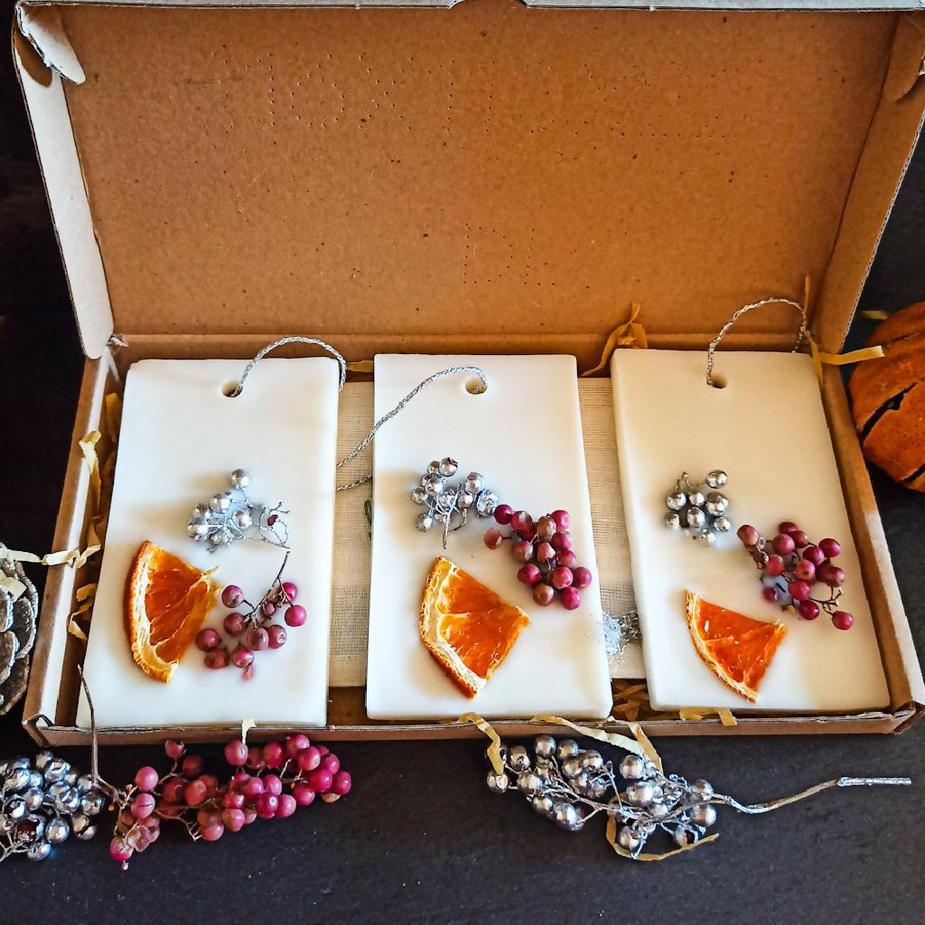 Handmade to order, these large ivory coloured soy wax melts are decorated with pink and silver berries and vibrant dried orange. The melts are placed together in a kraft gift box and a drawstring muslin bag is included so that clothes are protected when the tablet is used in drawers or wardrobes.