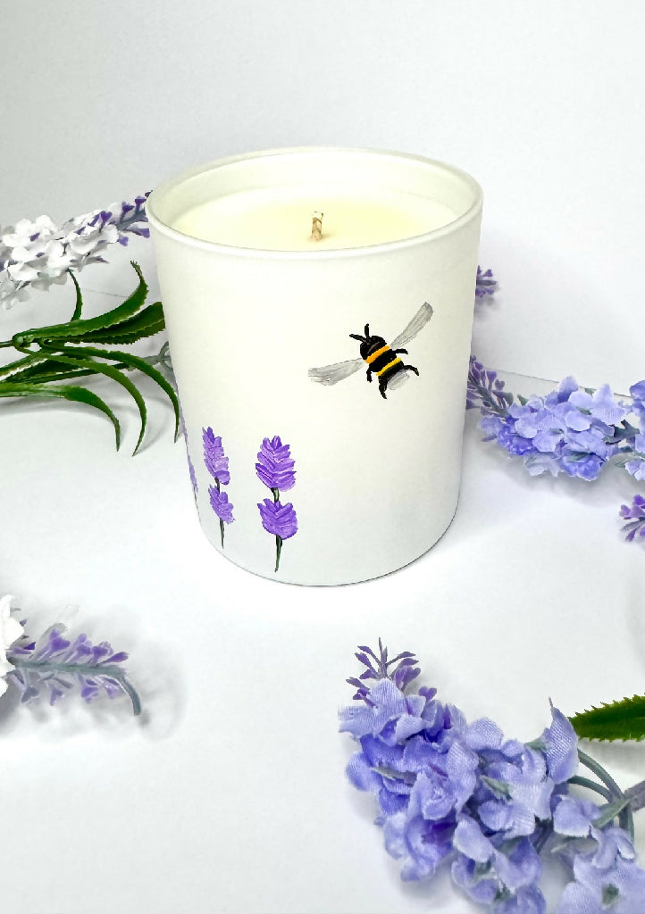 Immerse yourself in tranquillity with our 200g Lavender Neroli Candle, hand-poured into an elegant matte white glass jar. Each piece is uniquely hand-painted with delicate purple lavender and two charming bees, gracefully wrapping around the candle for a truly artisanal touch.