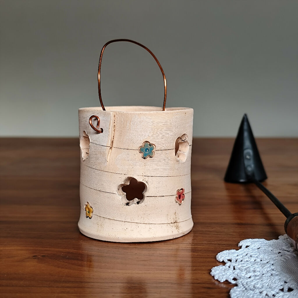 Floral ceramic tealight holder with daisy flower in bright colours. Once a tea light candle is lit inside, the cut-out shapes glow brightly and cast lovely streams of light around the room or garden. An eye-catching decoration even without the tealight lit.