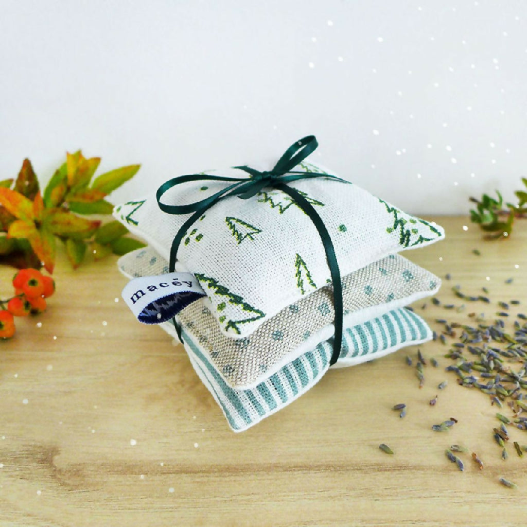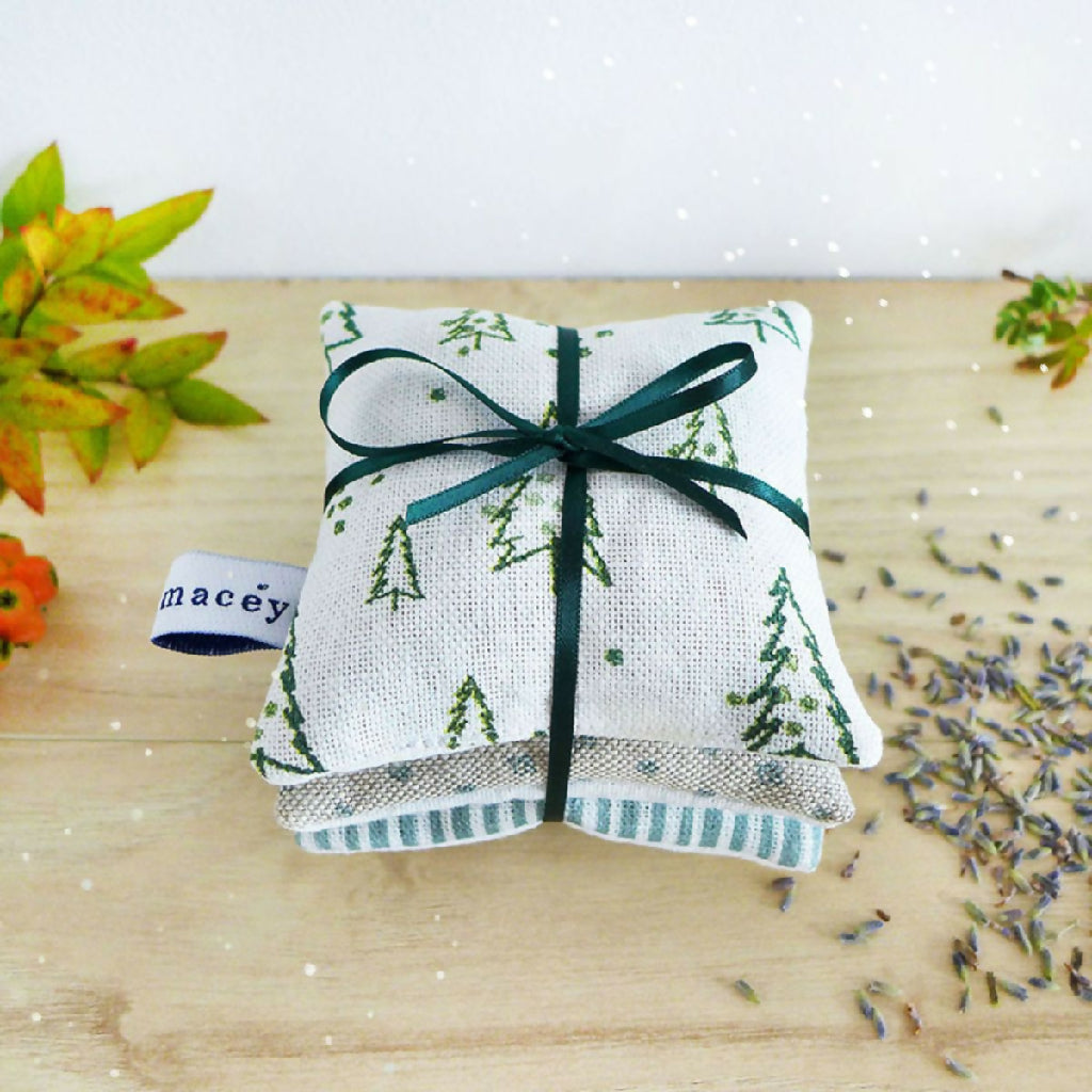 A Winter Forest print lavender bundle made of three scented bags and tied with ribbon. Charlotte's Winter Forest fabric print is developed from her embroidered illustrations, and inspired by calm days in amongst the trees.