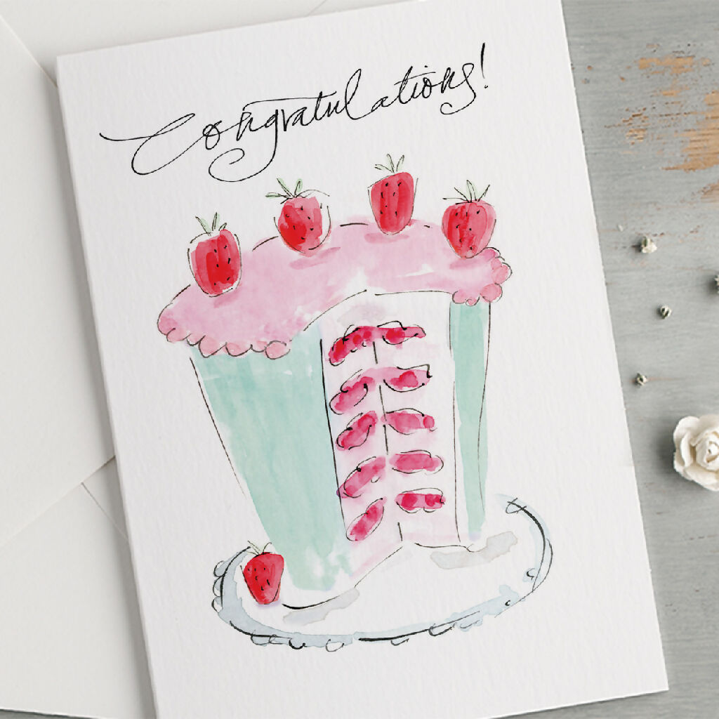 The vintage-inspired illustration of a large cake was originally hand drawn with a dip pen, ink and painted in a loose watercolour style. The calligraphy script was drawn with a dip pen.
