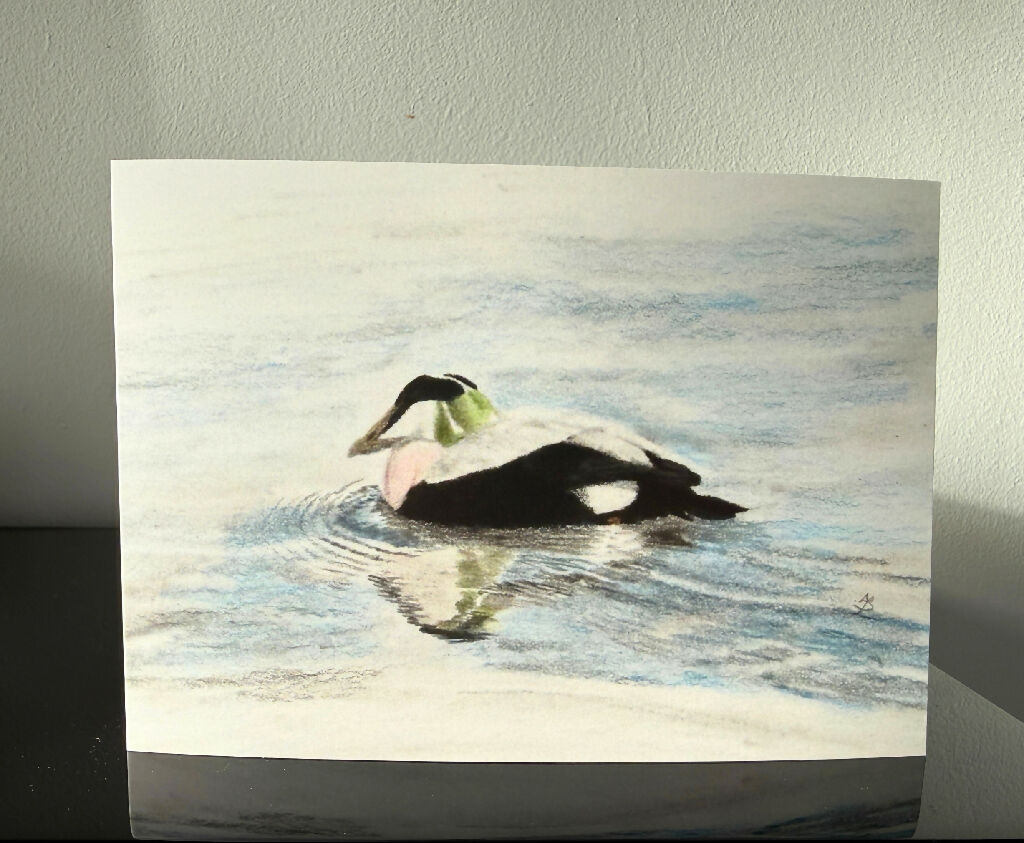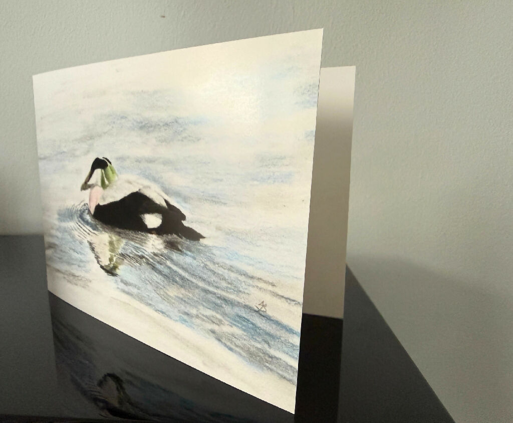 This greetings card features a hardy eider duck on smooth glassy water, printed from my original artwork inspired by a walk along the Northumberland coast on a calm winter's day, on FSC-certified smooth white matte 300gsm paper.