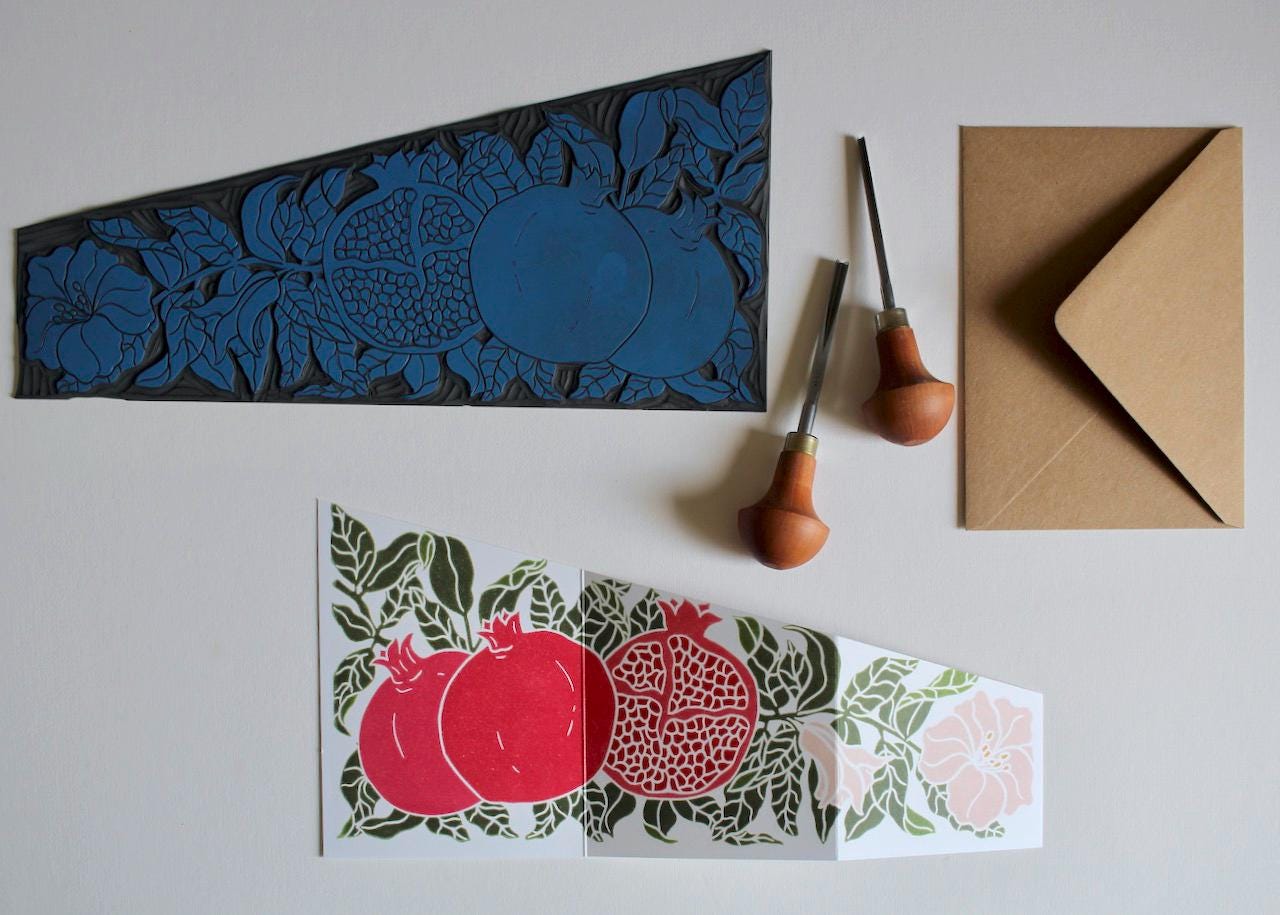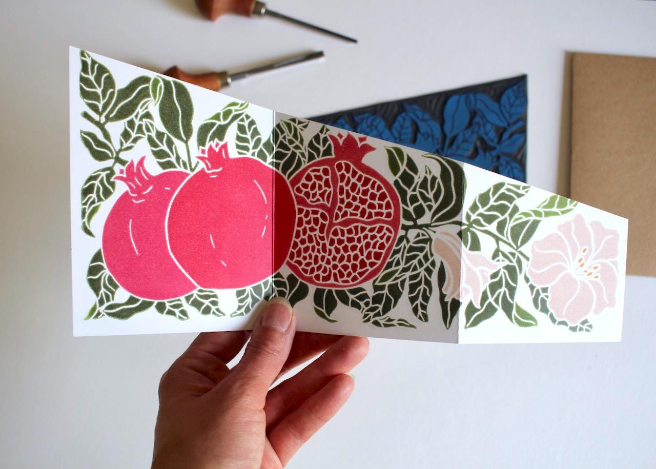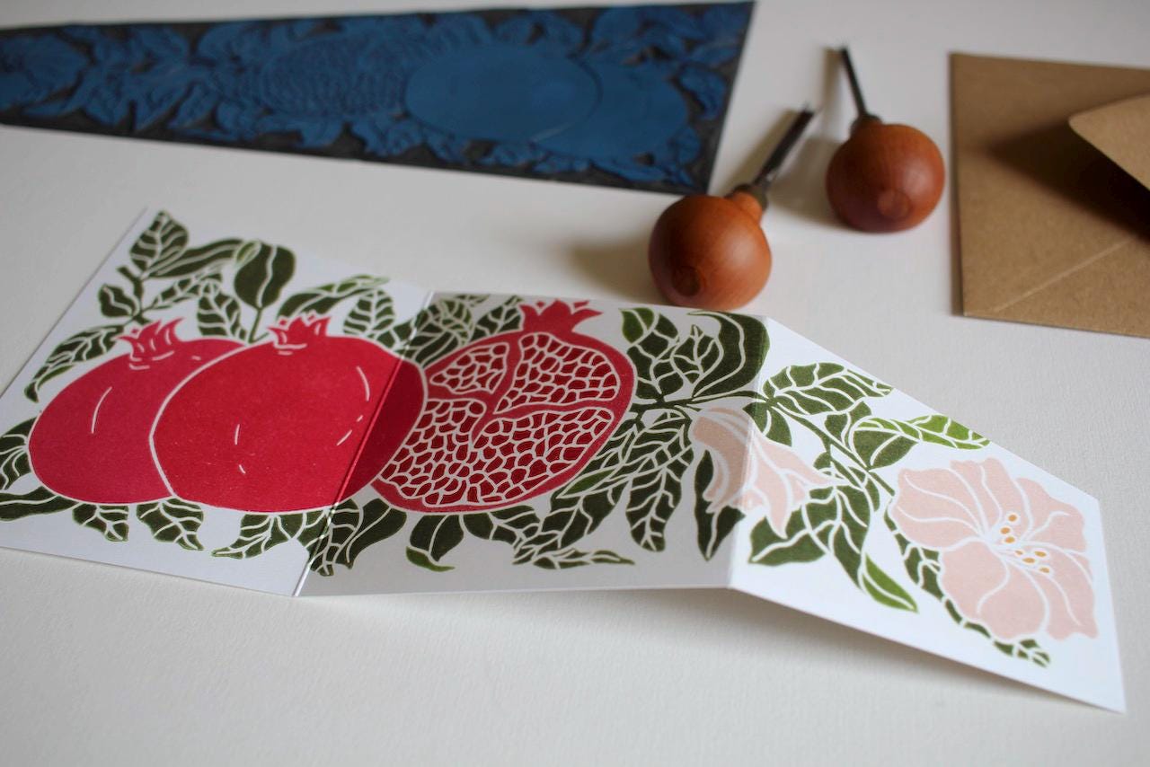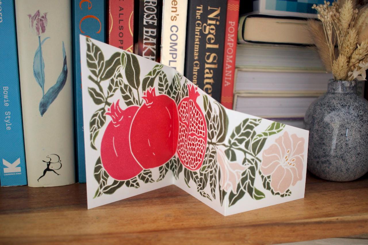 Pomegranates - the Jewel of winter and Christmastime. Wish your friends and family festive holiday greetings with this double-sided, botanical pomegranate card. A unique, sloped and concertina folded card, which is designed to stand out.