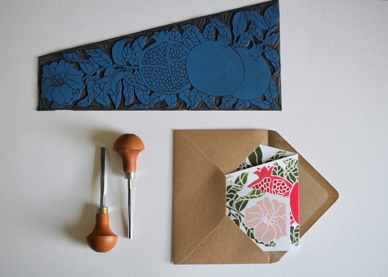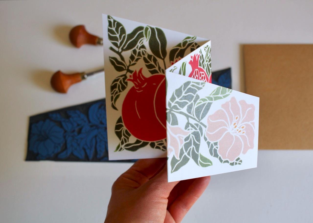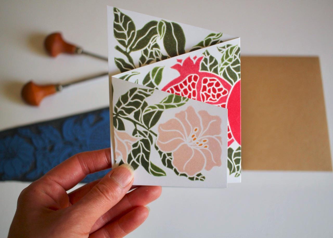 Pomegranates - the Jewel of winter and Christmastime. Wish your friends and family festive holiday greetings with this double-sided, botanical pomegranate card. A unique, sloped and concertina folded card, which is designed to stand out.