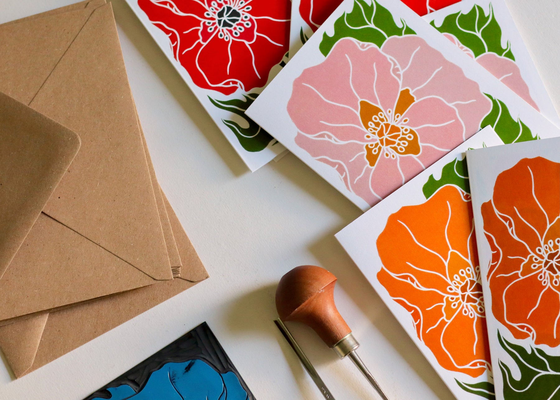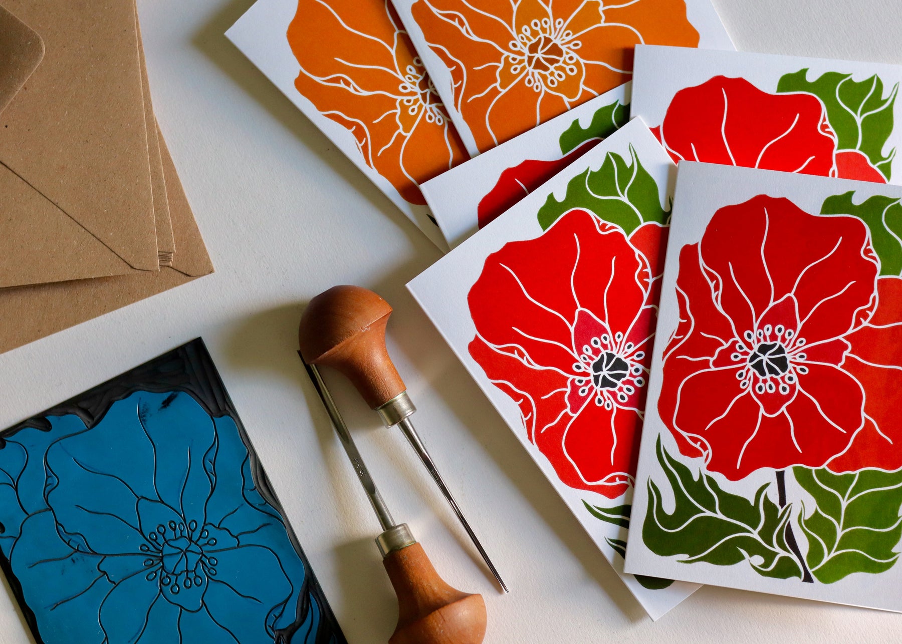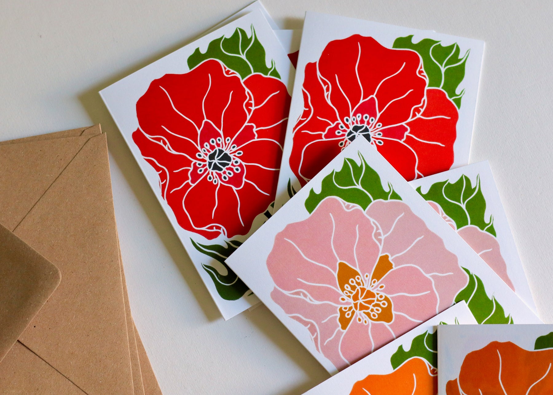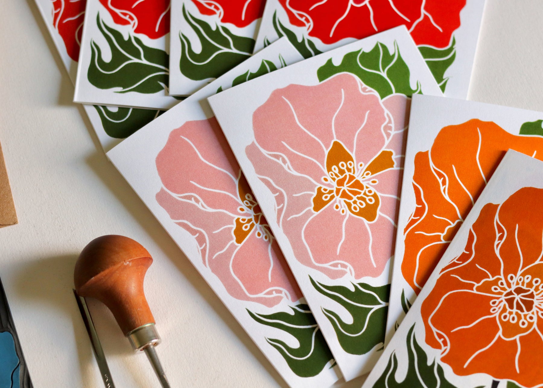 Inspired by solitary poppy blooms discovered along countryside paths, where individual flowers stand out like natural works of art. This graceful poppy linocut design celebrates the simple beauty that makes these flowers so beloved. The three colourways in this notecard collection represents the diversity found in the countryside - from the classic postbox red, which immediately catches the eye, to the warm amber-orange blooms that glow in morning light, and the softer pink varieties that add gentle romance to any wildflower display.