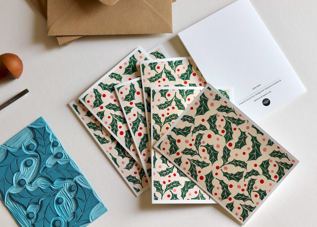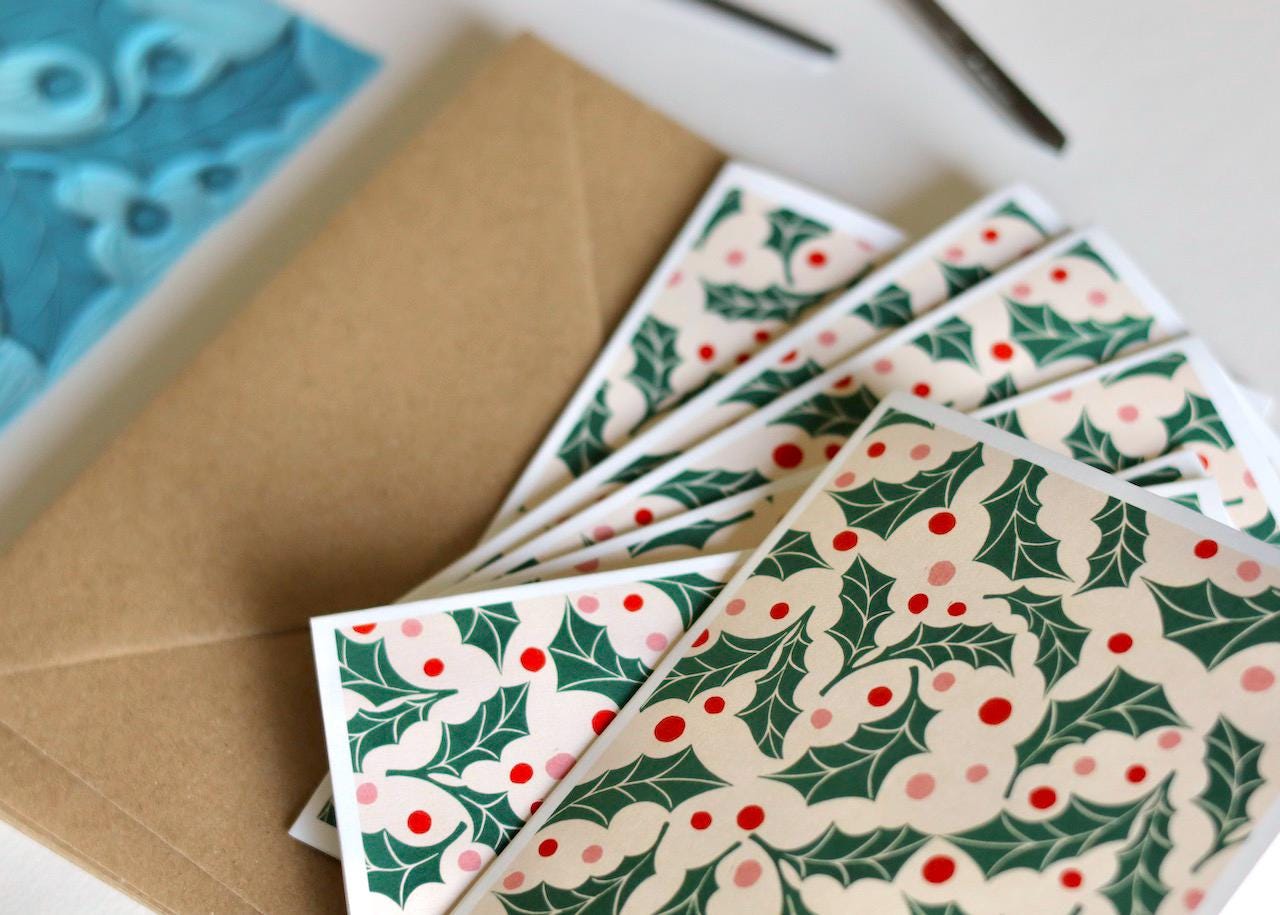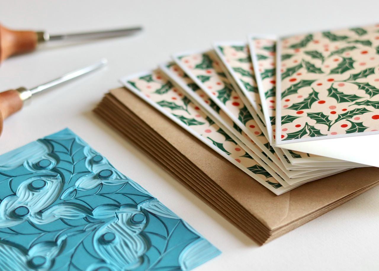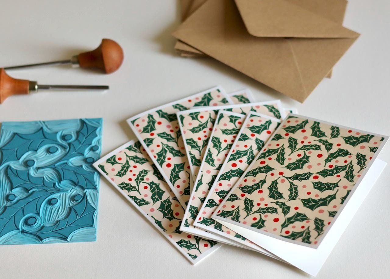 Jolly Holly Linocut Notecards - Set of 8 | Festive Cards & Envelopes