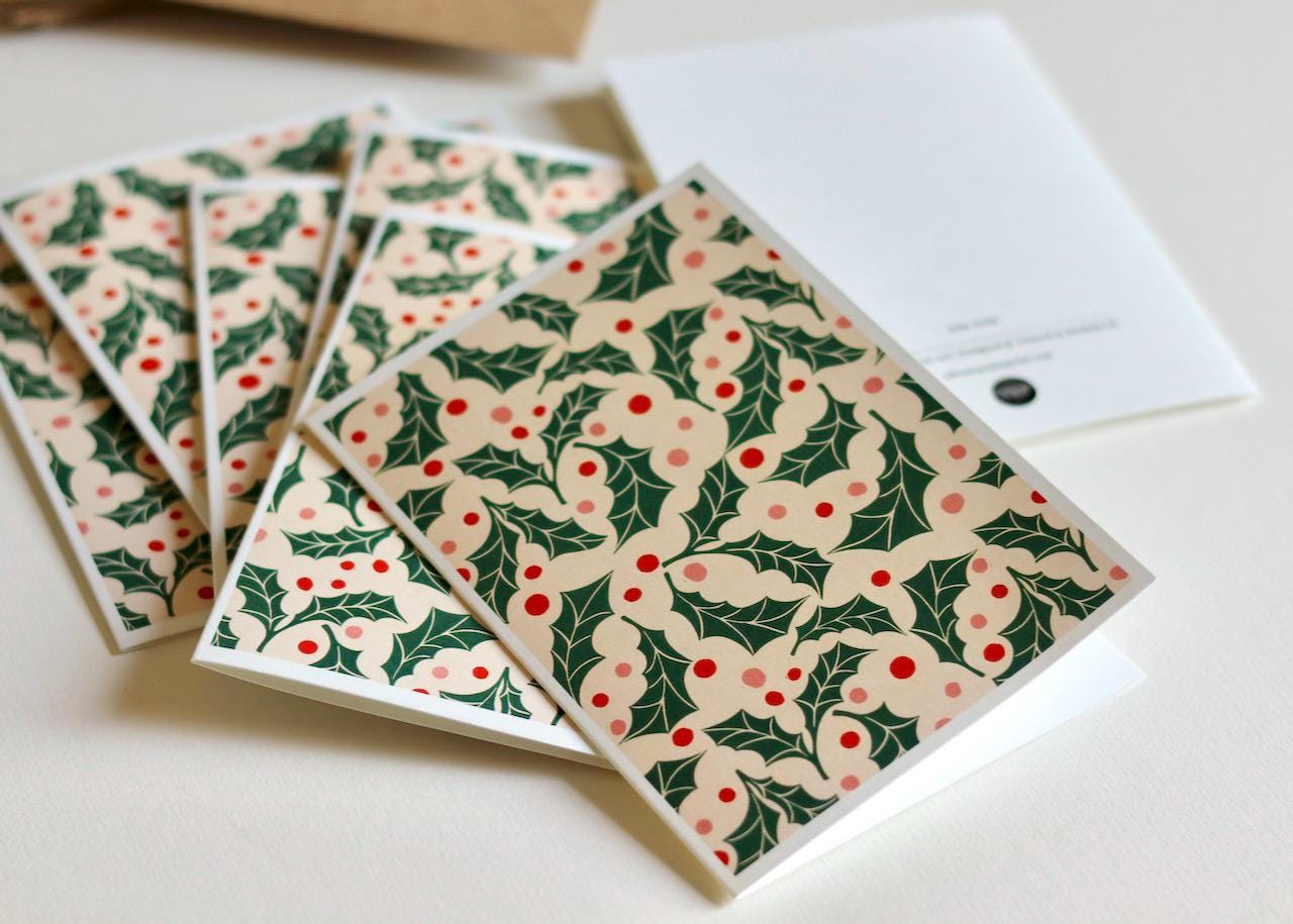 A set of 8 festive fun note cards featuring a repeat pattern of linocut holly leaves and polka dot berries in a green, pink and red colour palette.