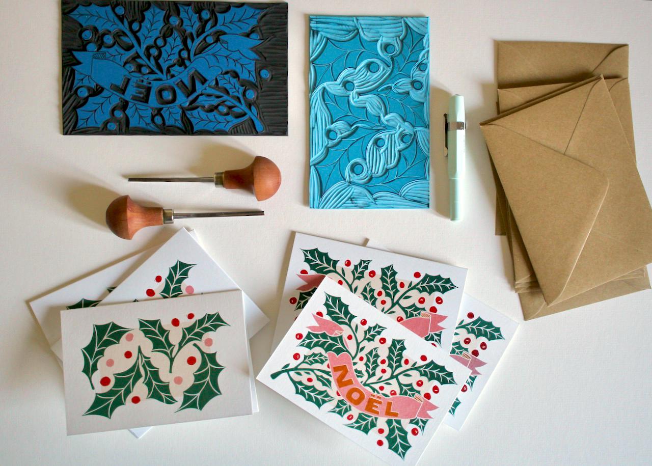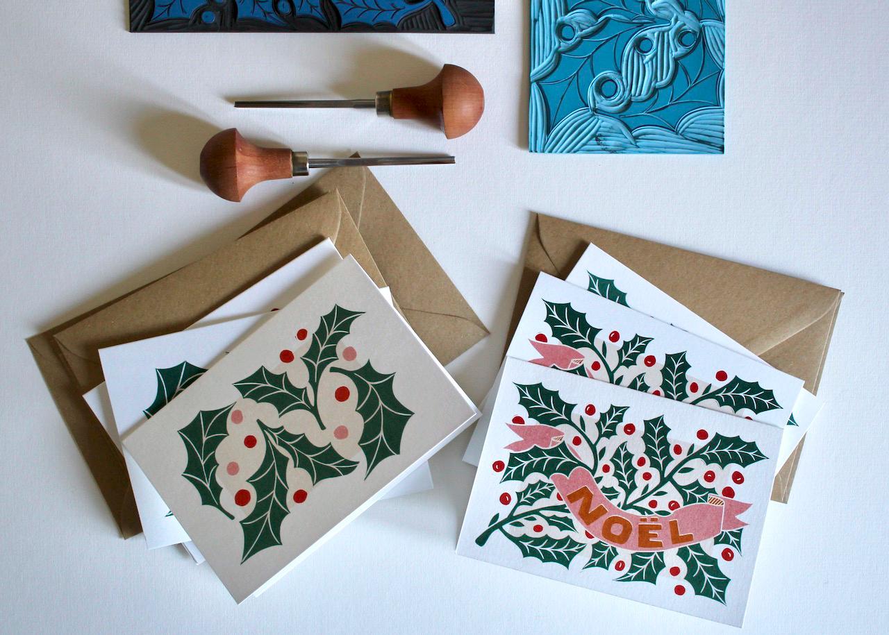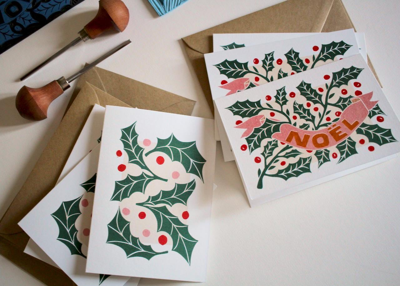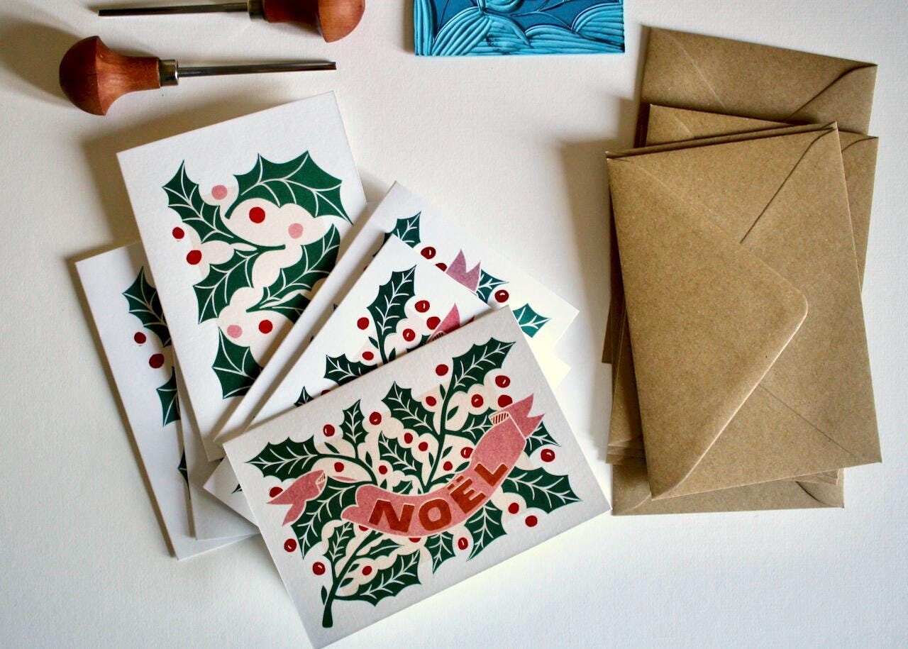Luxury Linocut Holly Leaves Christmas Card Set | Pack of 6 Cards & Envelopes