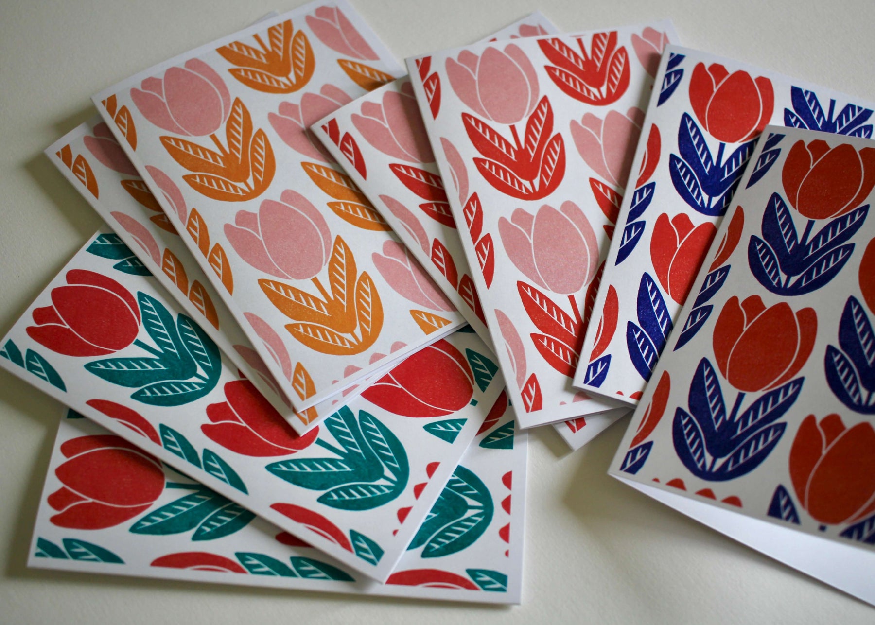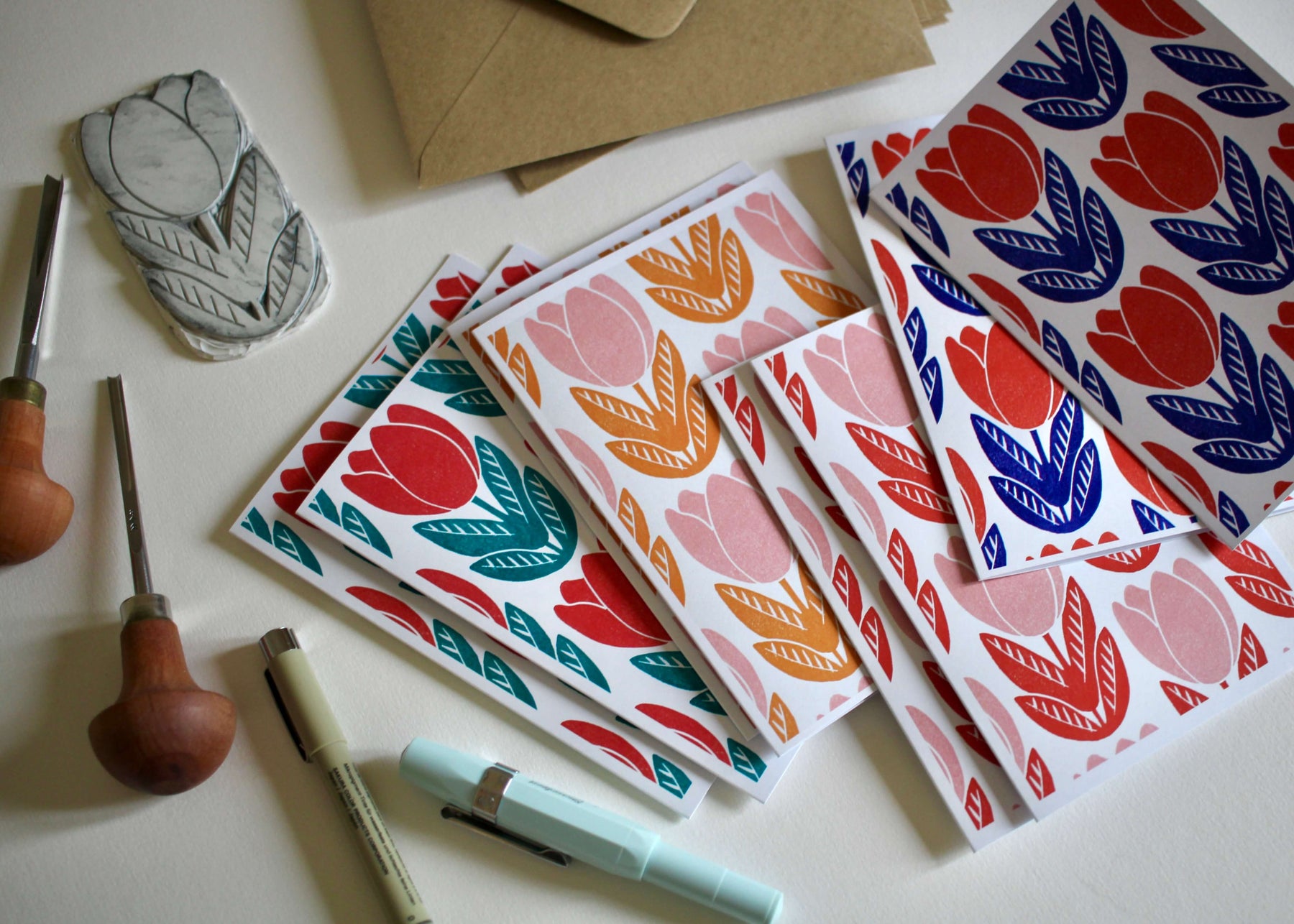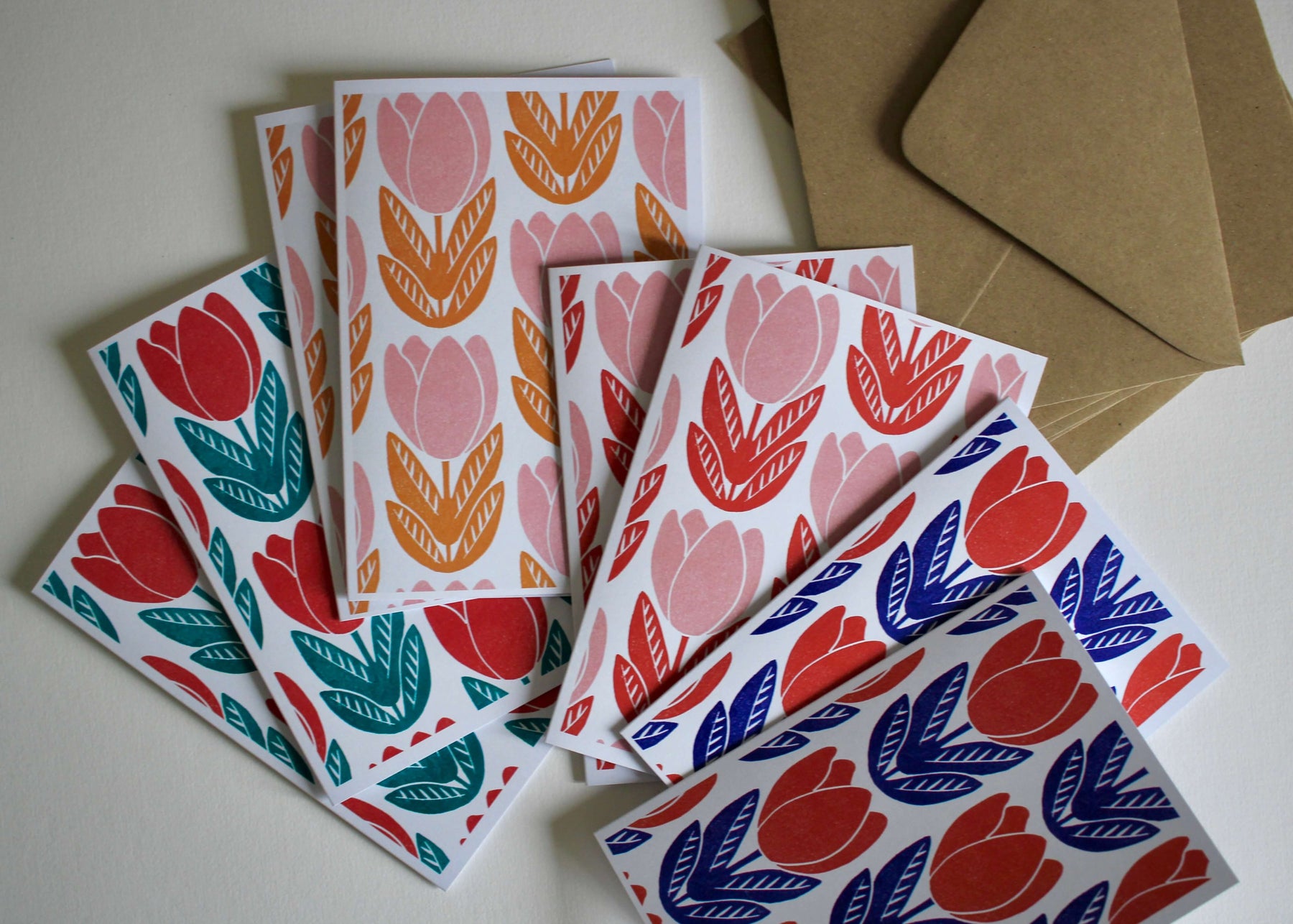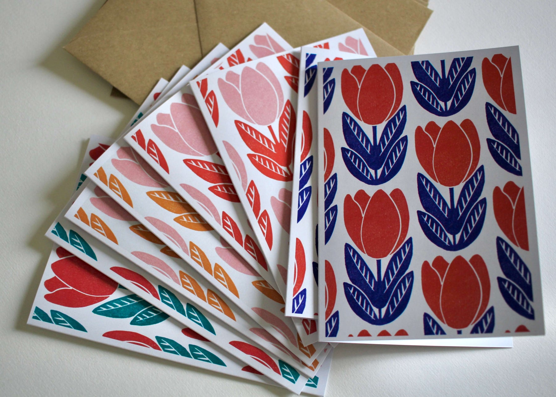 A set of 8 colourful notecards featuring a repeat pattern of a block print tulip flower. This pattern was originally created using linocut printmaking techniques and professionally printed onto superior quality, 100% recycled, matte card stock. Our notecards are printed in-house using digital printing techniques, maintaining a superior and vibrant finish.