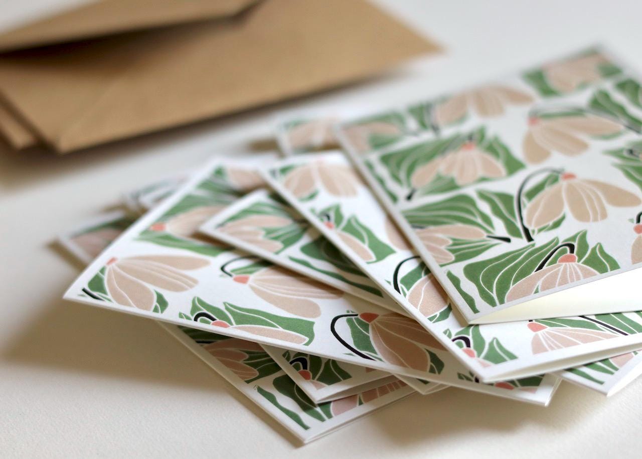 A set of 8 elegant note cards featuring a repeat pattern of linocut snowdrop flowers in a soft green and off-white palette. Snowdrops, one of the first flowers you'll encounter ...