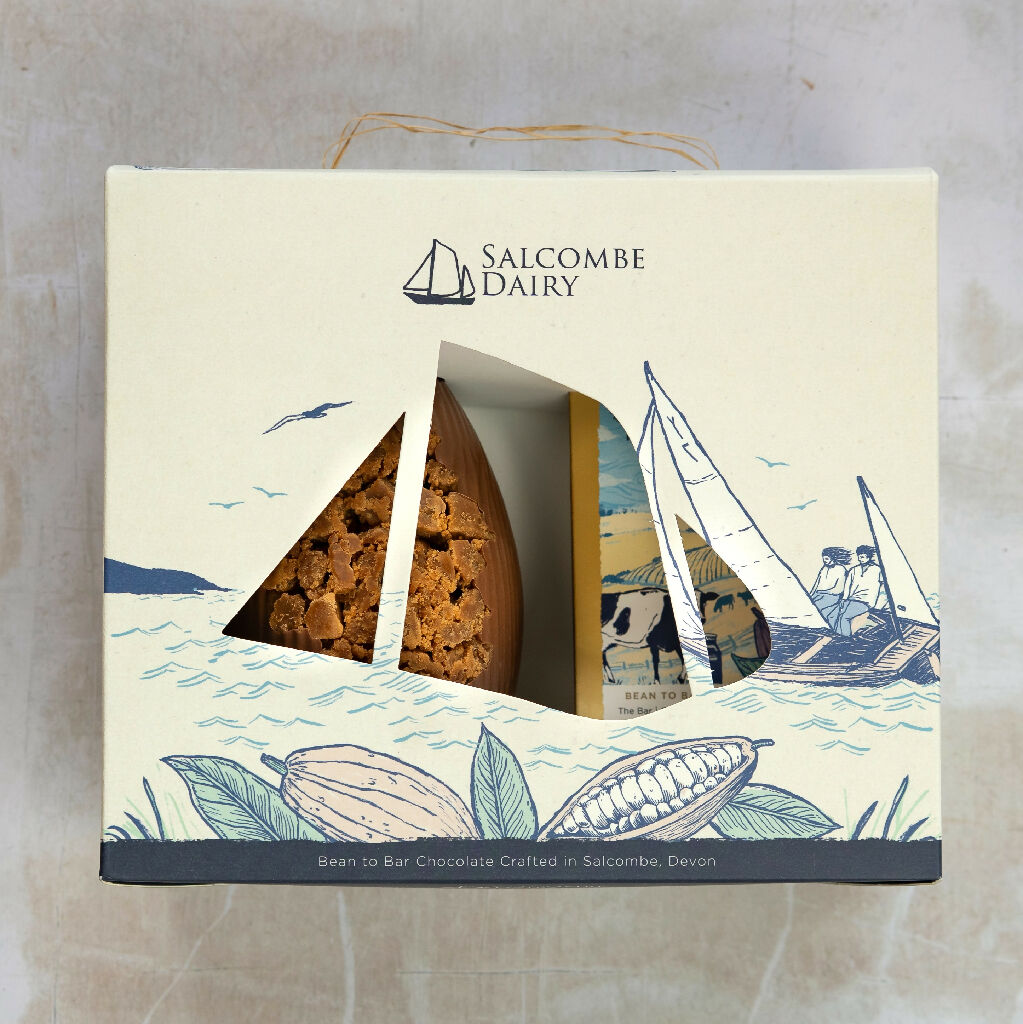 Presented in a fully compostable craft style box featuring our signature yawl-shaped cutout, this is a beautifully crafted Easter treat that brings together fudge lovers and milk-chocolate devotees alike.