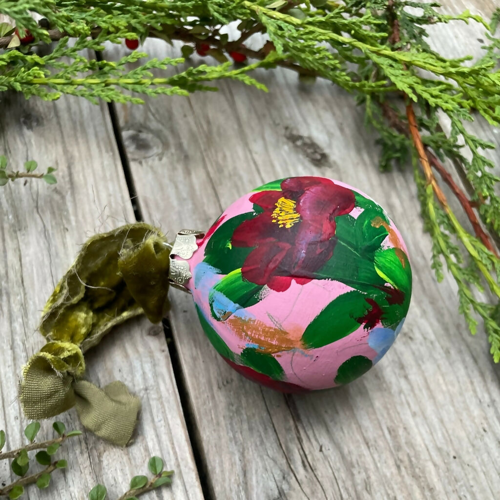 A beautifully hand-painted floral ceramic bauble background painted in deep green adorned in vibrant red quince flowers, finished with a luxurious velvet ribbon.