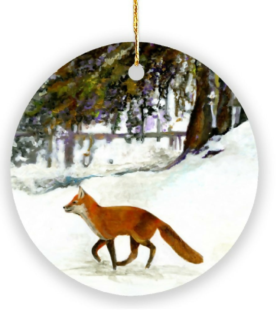 Classic Ceramic circle shape hanging Christmas Tree ornament. Two sided with the same image of Reynard's walk home taken from original painting by Susie Lidstone Approximate size 75mm x 75 mm
