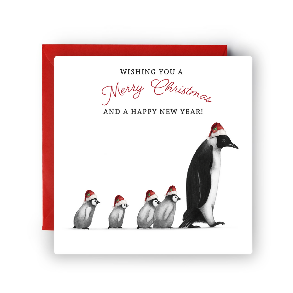 Share the cuteness this winter with our heartwarming 'Follow Me Penguin' Christmas Card! This charming design features a sweet, slightly perplexed parent penguin leading a delightful parade of baby penguins through the snow. It's the perfect card to send holiday cheer to family and friends.