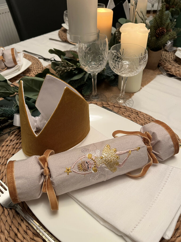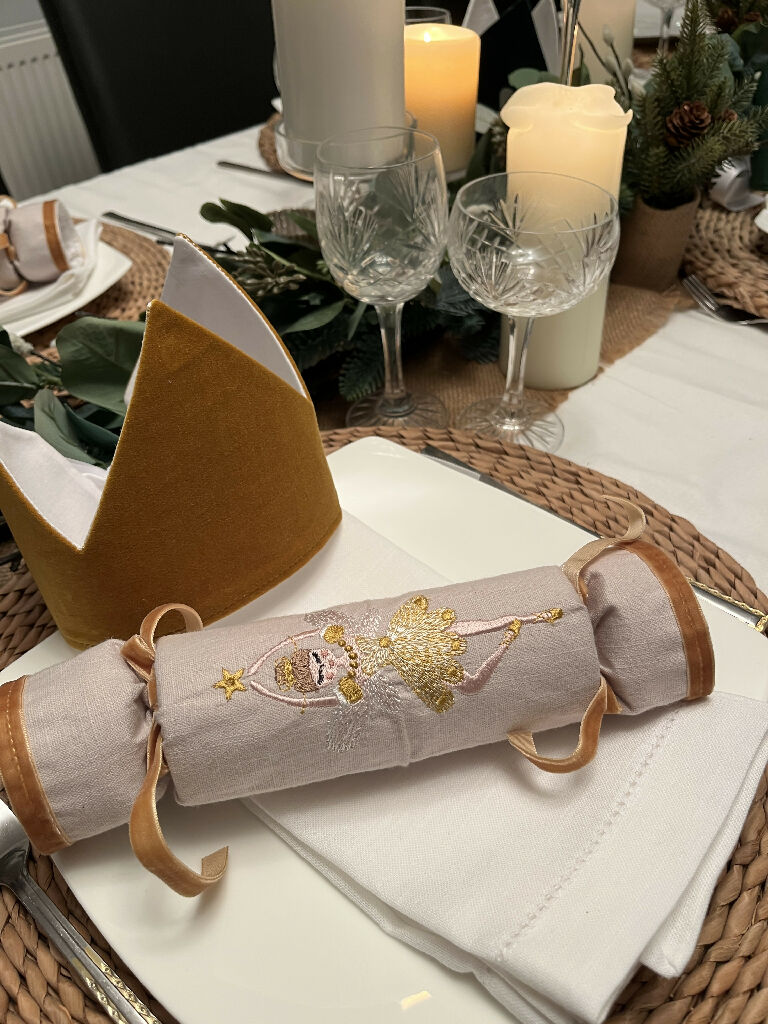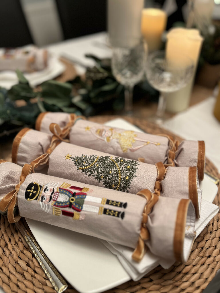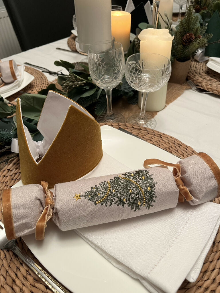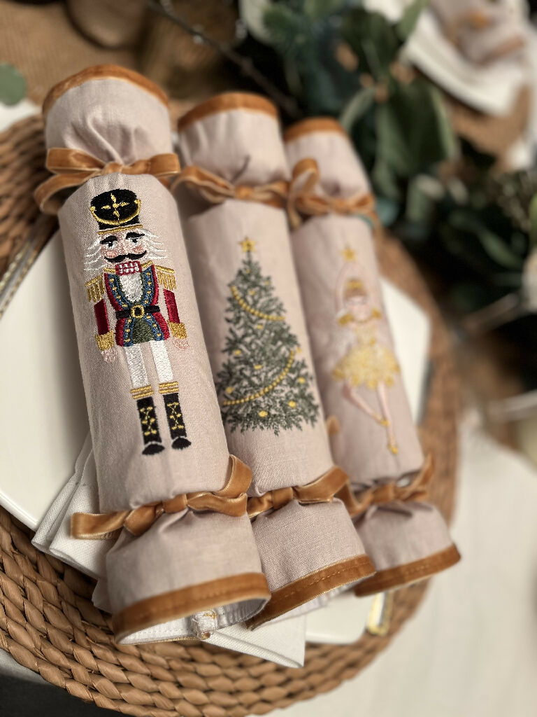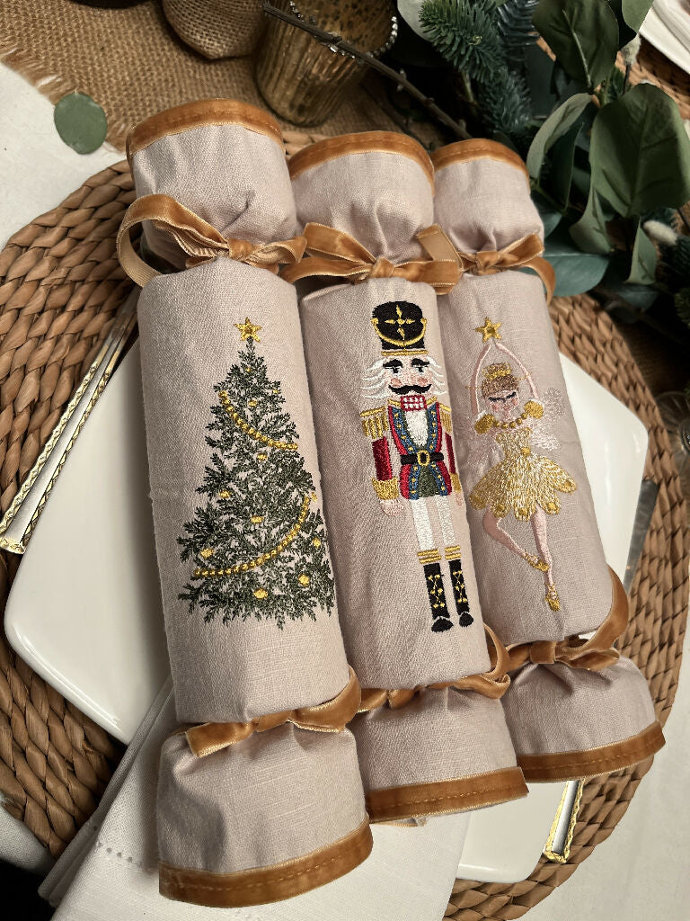 Six beautiful handmade fabric linen Christmas crackers that you can customise and fill yourself. These stunning crackers would be a splendid addition to any Christmas table. They have been embroidered with three different designs, a Nutcracker, Fairy and a Christmas tree on natural coloured linen. The end of each cracker has been accented with velvet and matches the ribbon used to tie the cracker.