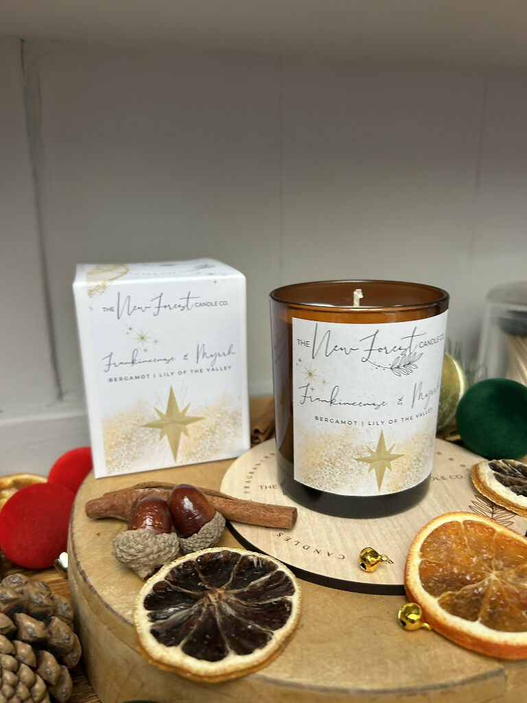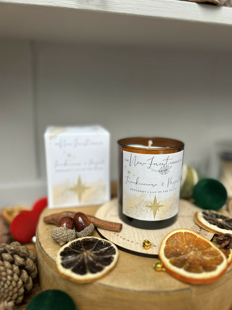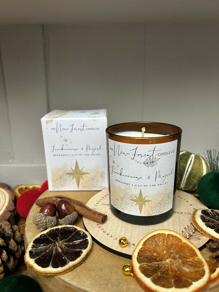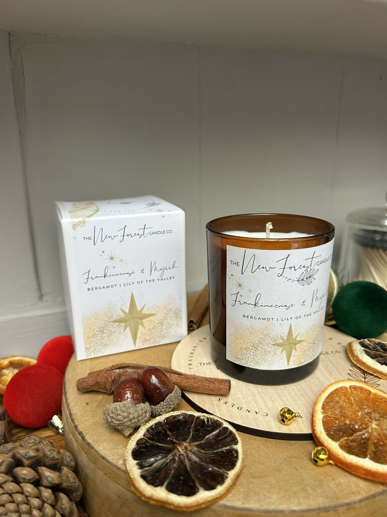 Step into a realm of gilded elegance with our Frankincense & Myrrh Scented Candle. Notes of bergamot and lily of the valley weave themselves into a fruity and musky symphony, captivating your senses and recreating the excitement and opulence of holiday parties.
