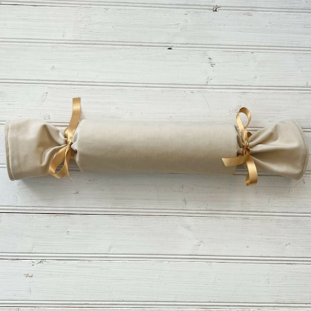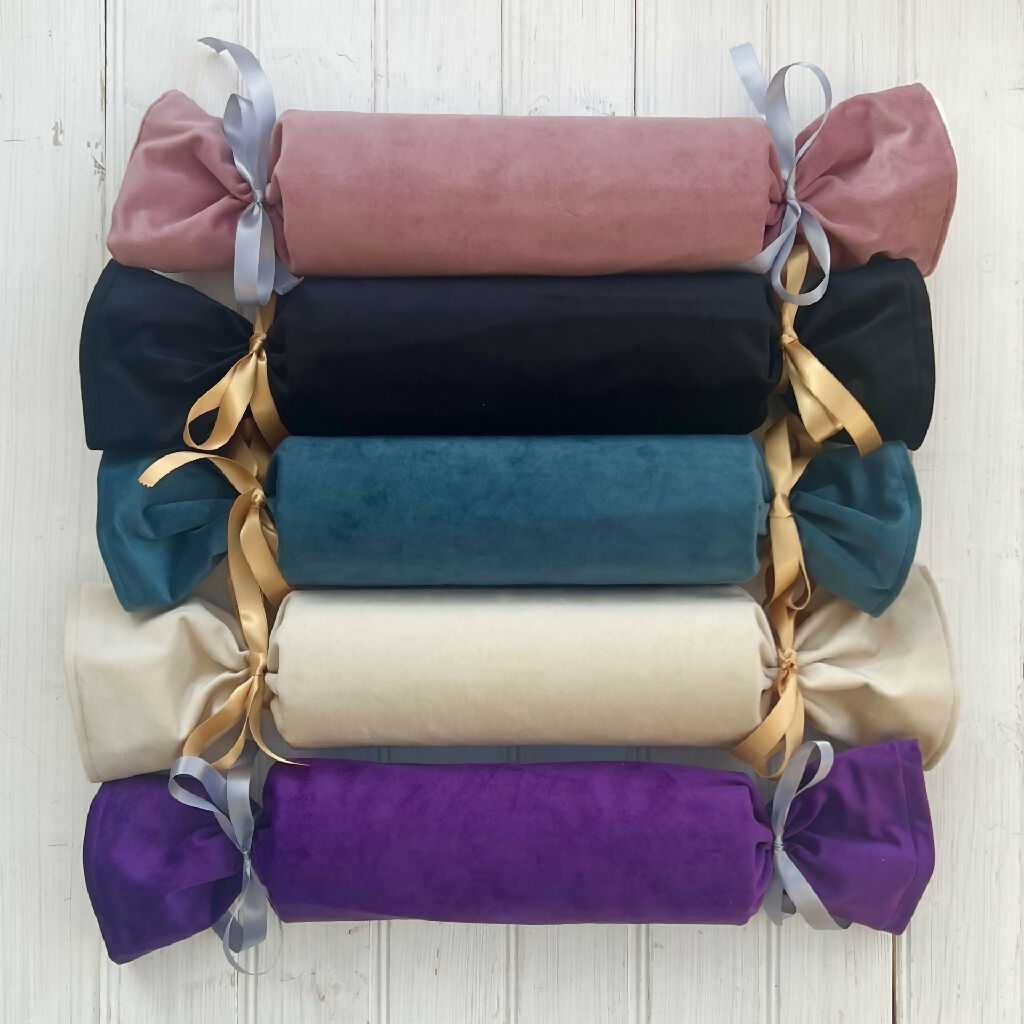 Every cracker is handmade from your choice of high quality champagne, peacock, soft pink, velvet super soft fabric. and features luxurious satin ribbon ties in your choice of gold or silver or rose gold that are sewn into the fabric so they won't get lost. Each one is lined with white cotton fabric for extra luxury and it also ensures the cracker keeps its beautiful shape at the ends.