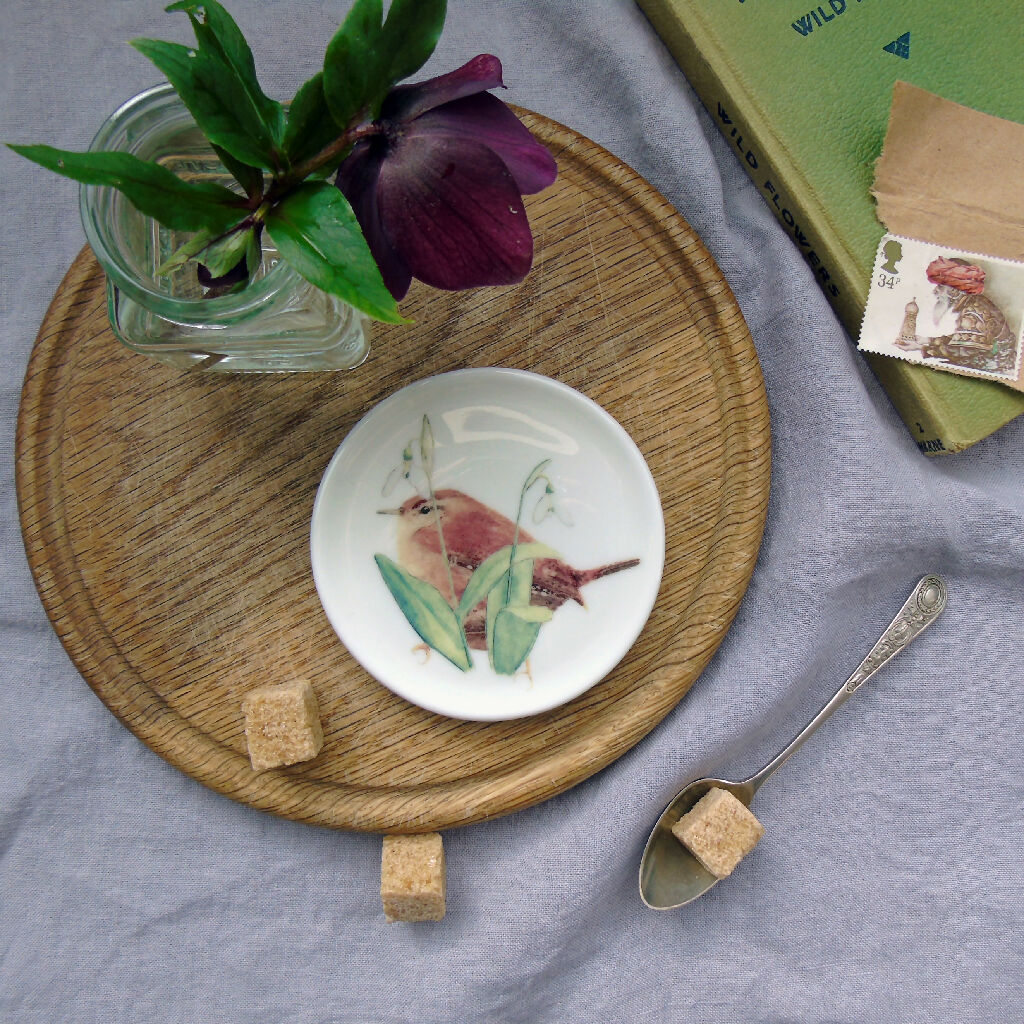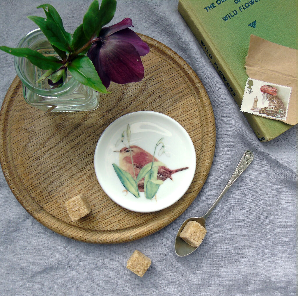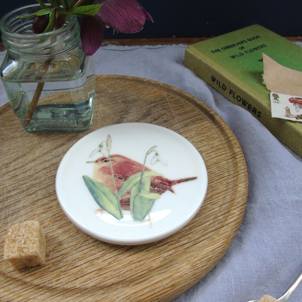 Fine bone china coaster featuring my sweet watercolour painting of a tiny wren peeking out from behind the snowdrops, a lovely small token gift for bird lovers and gardeners. The coaster has a slight rim so is also suitable to use as a spoon rest.