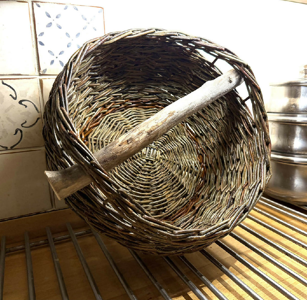 Woven with a mix of willows using a herringbone weave, this large bowl has a striking appearance and is very much a statement piece. The Italian driftwood handle adds to it's unique character and rustic appeal.