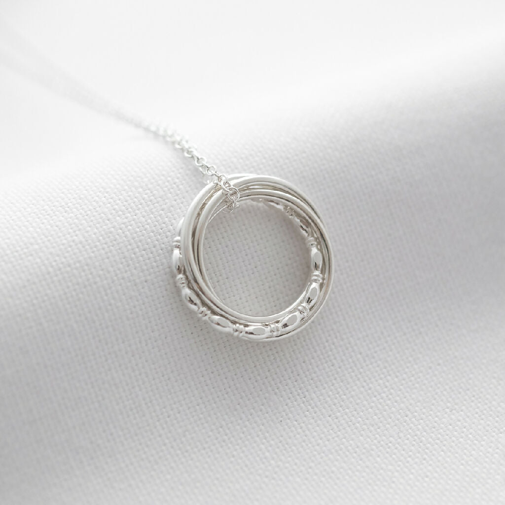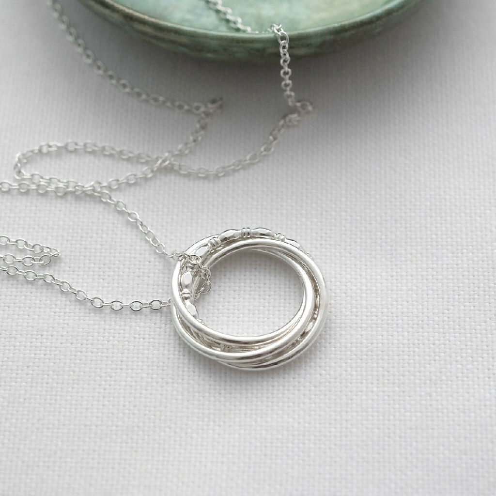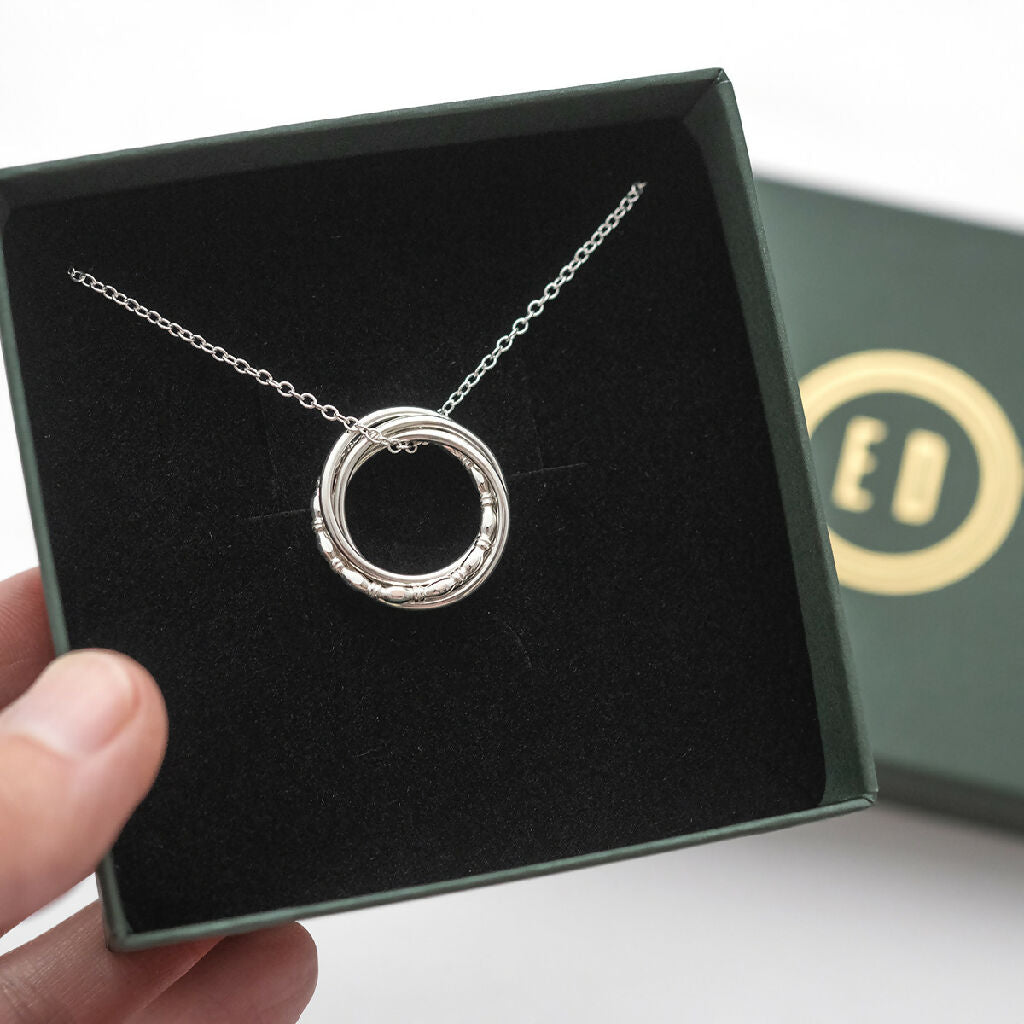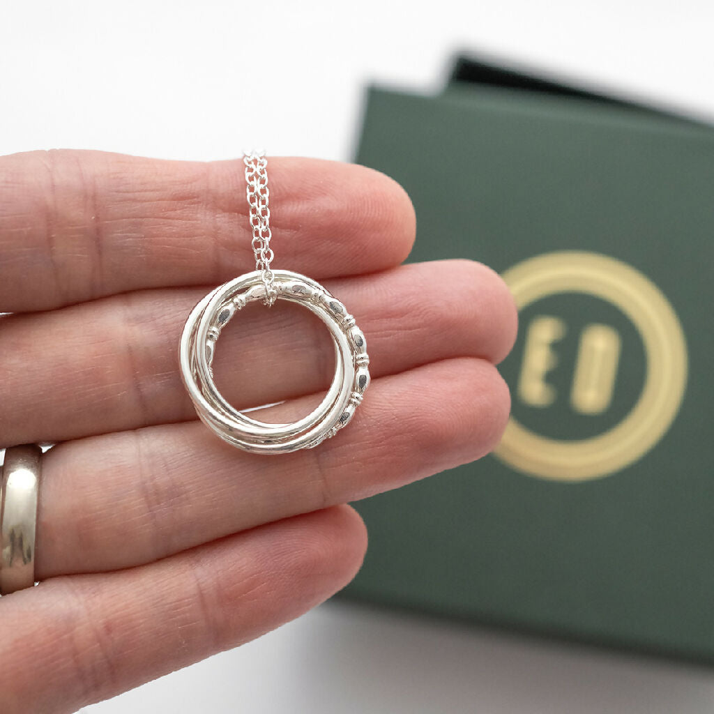 They’re also a popular choice as a family necklace and a celebration of life long friendships with each ring representing each person.