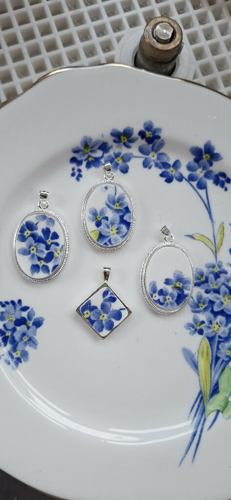 Hand crafted by Trisha Wood in Somerset, UK, this sterling silver pendant features reclaimed china with a pretty blue hand painted forget me not pattern. A sustainable, one-of-a-kind piece of timeless charm makes a lovely china anniversary gift