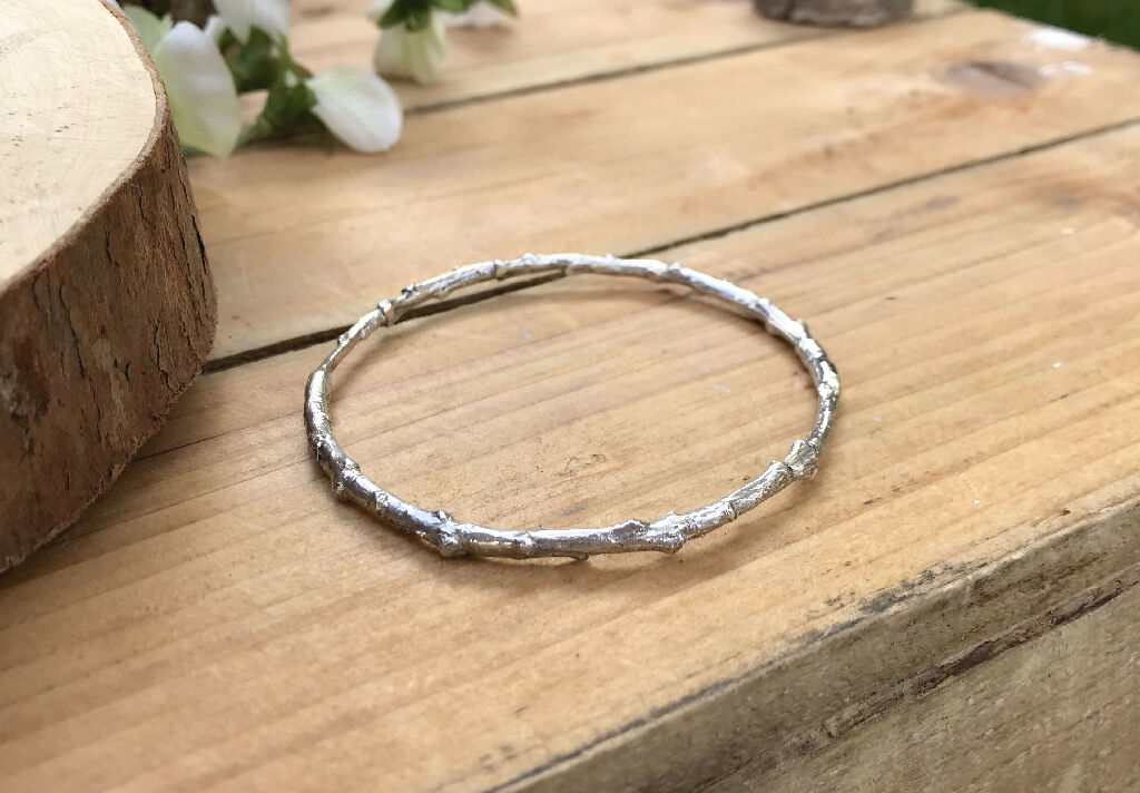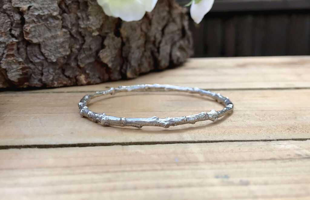 This chunky, solid bangle is handcrafted from .925 sterling silver using the cast of a real twig. Employing the ancient technique of Lost Wax Casting, the twig is transformed into solid silver, capturing the natural texture and organic form of the original branch. The metal is then carefully shaped into a distinctive, nature-inspired bangle.