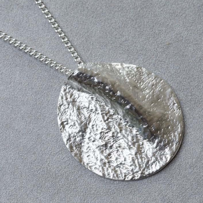 I like the simplicity of this design. A textured circle of fine silver is free-formed to create the hint of an ocean wave.