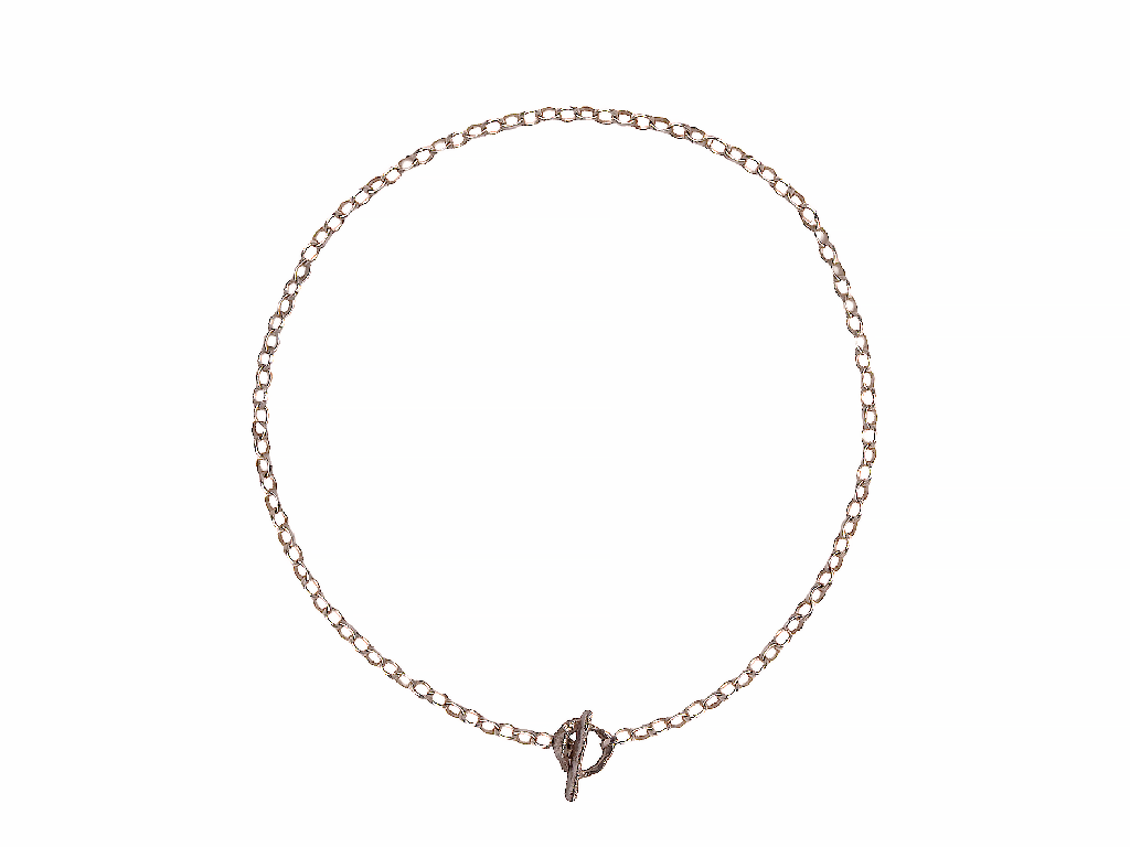 A beautifully weighty, chunky silver belcher chain with organic T bar ring and clasp. The fluid clasp was inspired by espaliered trees I spent time with this spring, the apple blossom stems being twisted and formed into incredible spirals. A perfect everyday chain to wear with any outfit, The clasp can be worn at the front for intrigue, or put at the back for a plainer look.