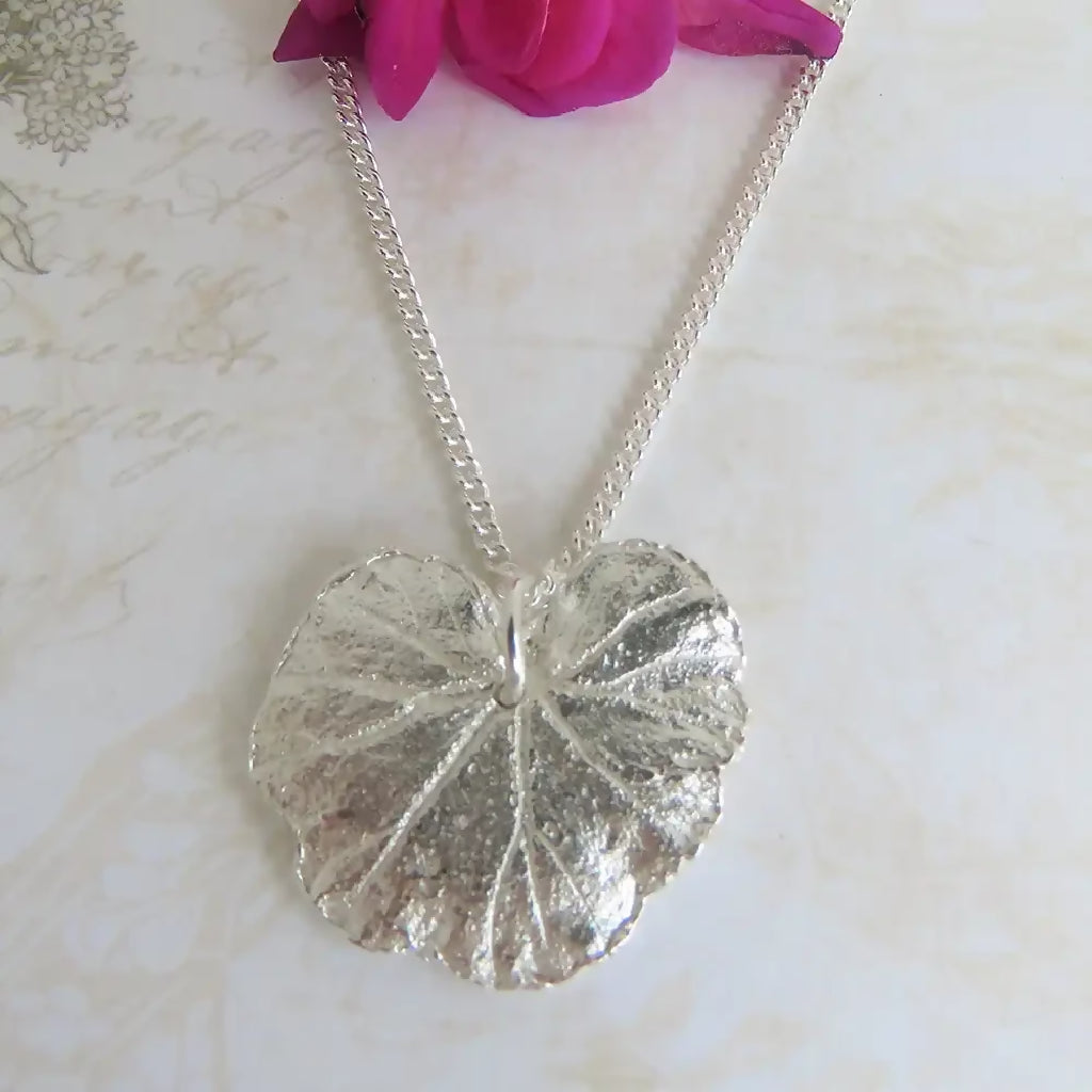 This delicate geranium leaf necklace is handcrafted in fine silver. Each one is made separately and therefore remain unique. The typical width of the leaf is 2.2cm at its widest point. The leaf is attached to the chain using a sterling silver jump ring and the chain is I have chosen to complement the design is a 45cm sterling silver curb chain. If you would prefer a different style or length, please contact me and I will do my best to accommodate.