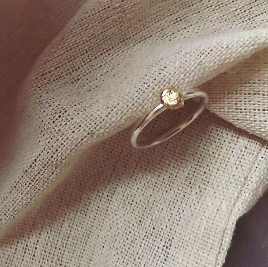 The perfect ring for those who want to mix silver and gold. These stacking rings are handmade with either a smooth or a textured band surface. Frances Kirk is known for a love of texture and a nugget obsession, this ring is where it all began. You can choose between a smooth band which contrasts nicely with the organic nugget texture, or a textured band for a more organic look.