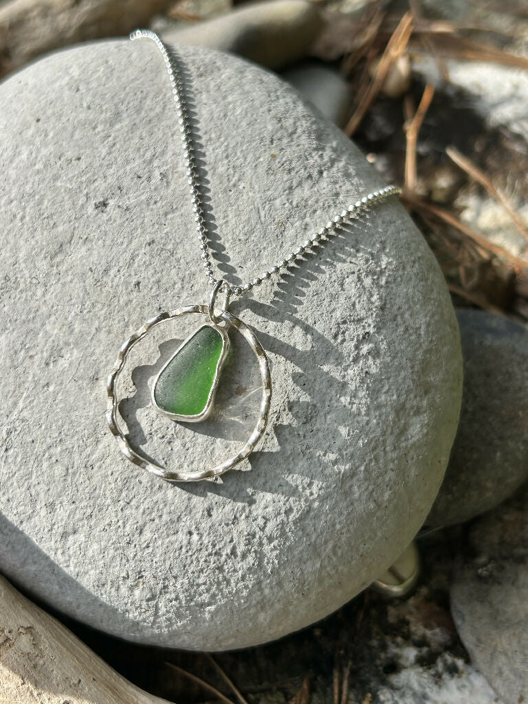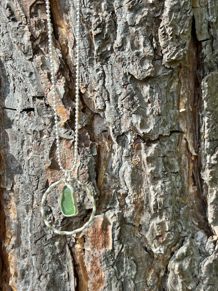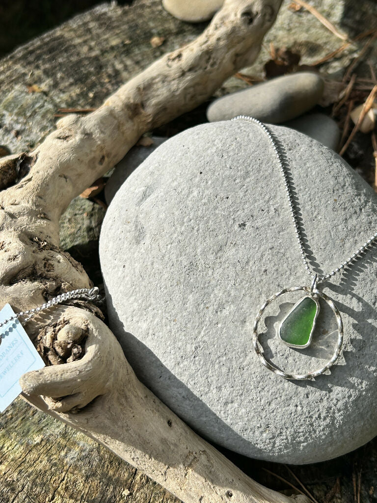 Seaglass necklace green Seaglass, set by hand in a silver bezel. Comes on a silver chain 16” silver chain Other chains can be ordered on request Inspired by the sea. Designed ...