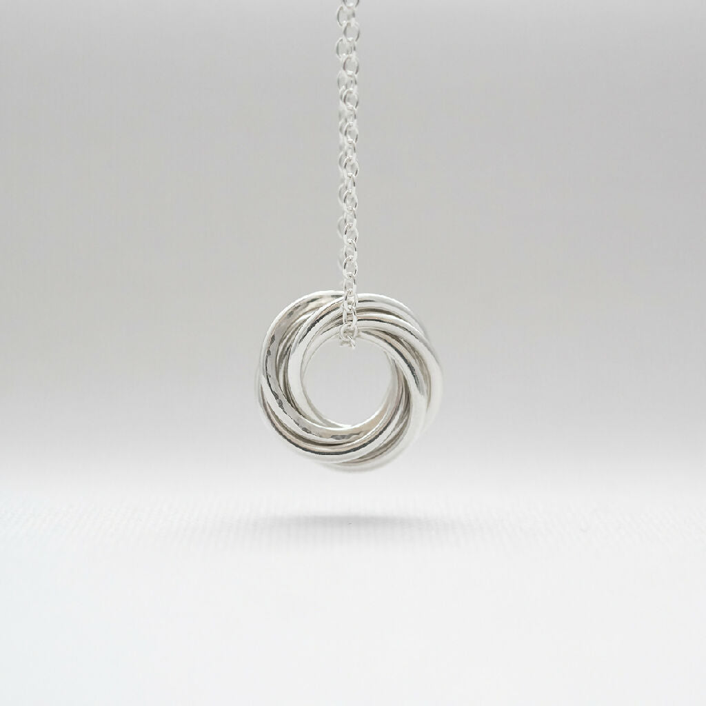 This elegant design features six sterling silver rings, five with a smooth, polished finish and the sixth ring has been finished with a lightly hammered texture, adding subtle contrast. The 6 interlinked rings allow for gentle movement, giving the necklace a beautiful tactile feel.
