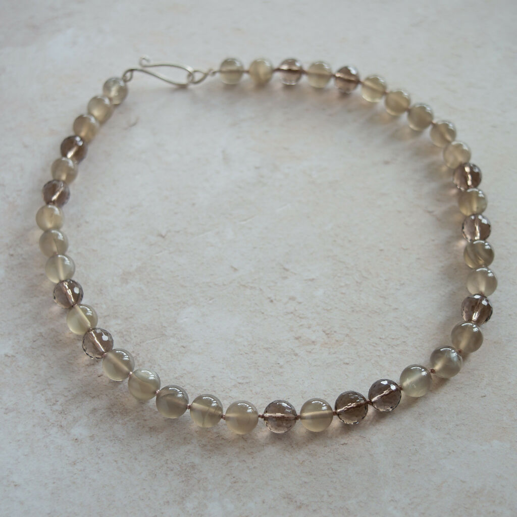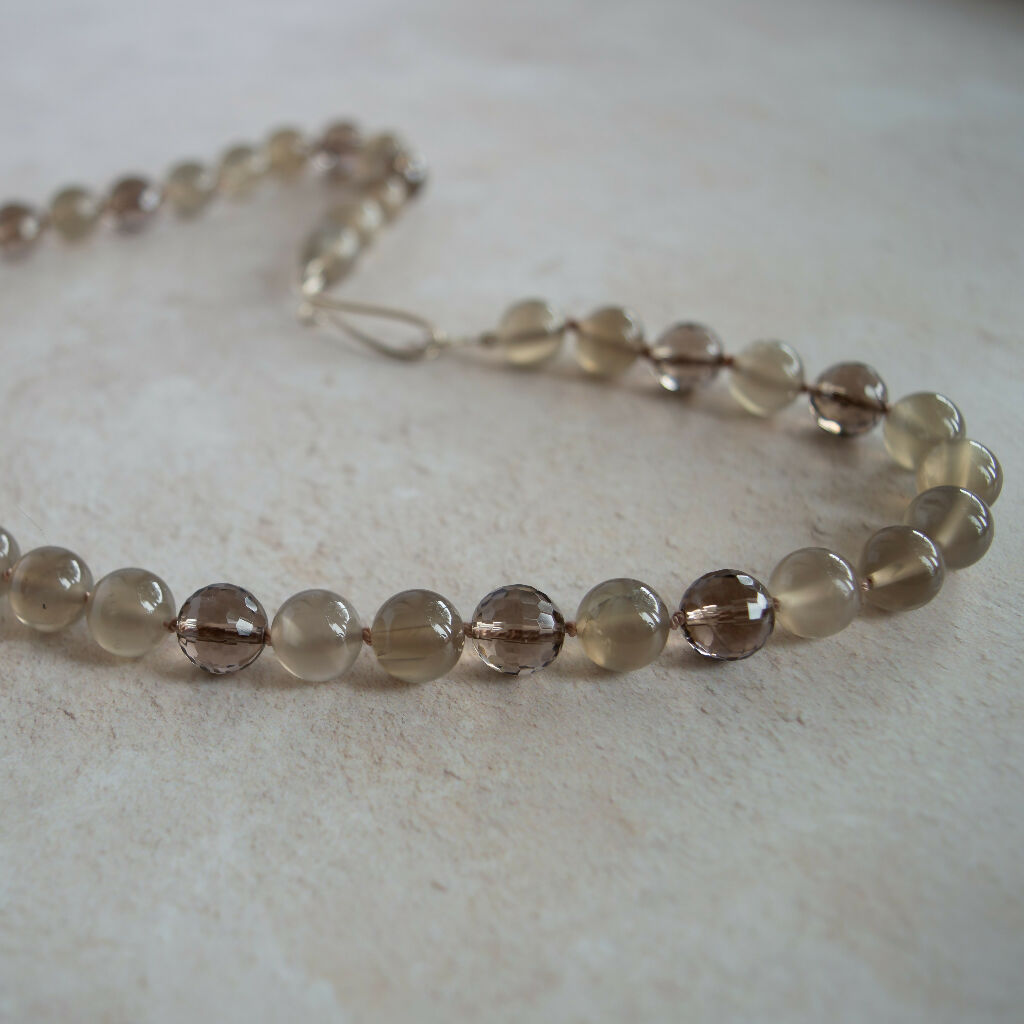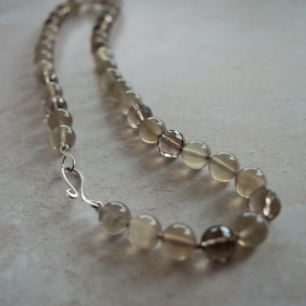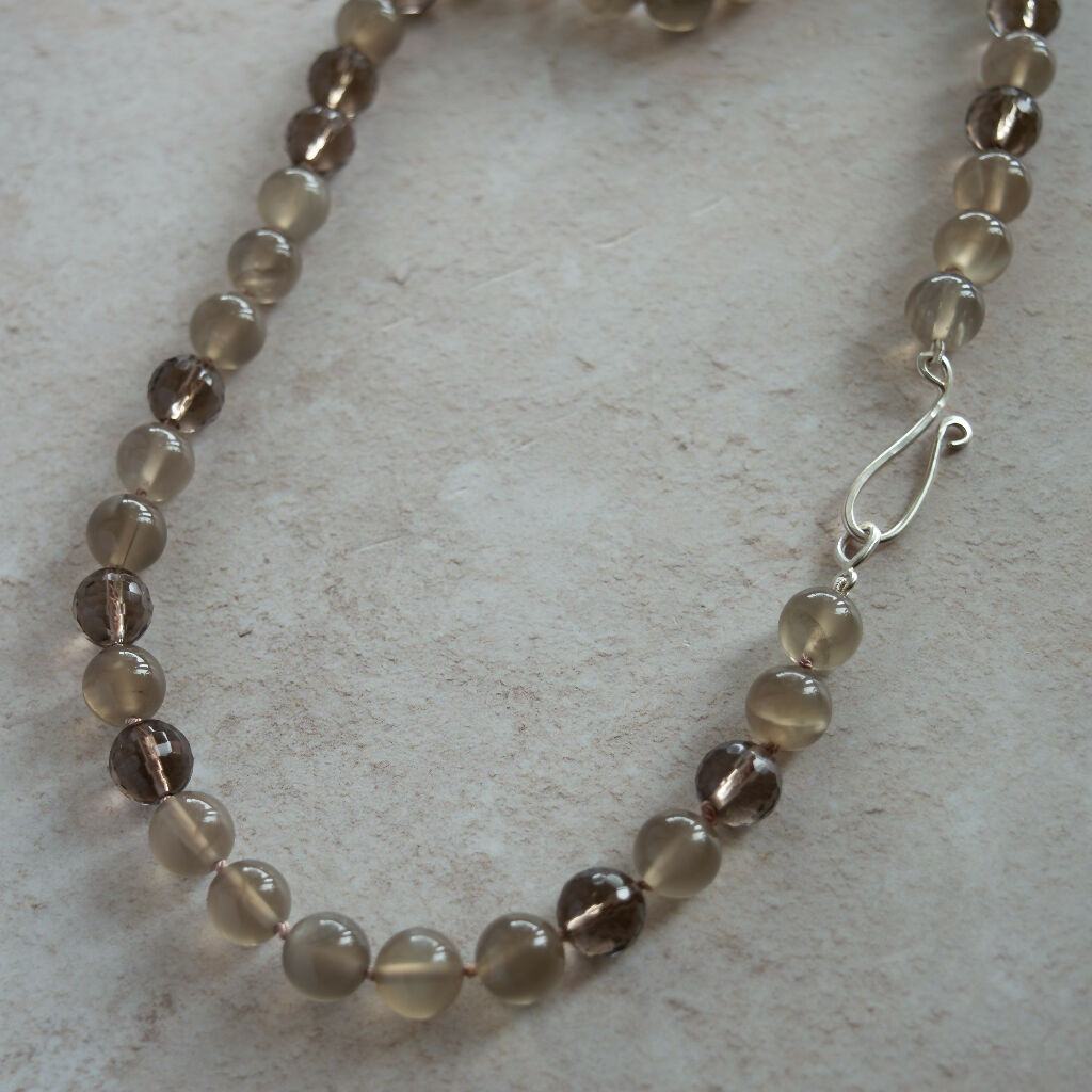 A beautiful classic necklace featuring a blend of round Moonstones and round faceted Smokey Quartz gemstones. Threaded and knotted on silk with a one-of-a-kind Handmade forged Sterling Silver clasp.