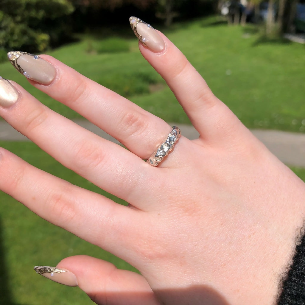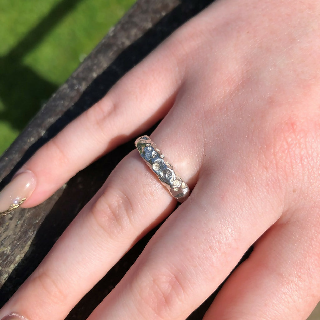 The ring is firstly carved in wax, a slow but mindful process, creating the rocky texture once the ring is shaped. It’s then cast into recycled sterling silver using the time-honoured technique of lost wax casting. The wax ring is lost during this process, ensuring each ring is unique and individual to its owner.