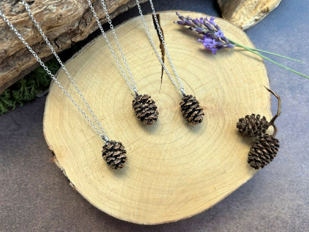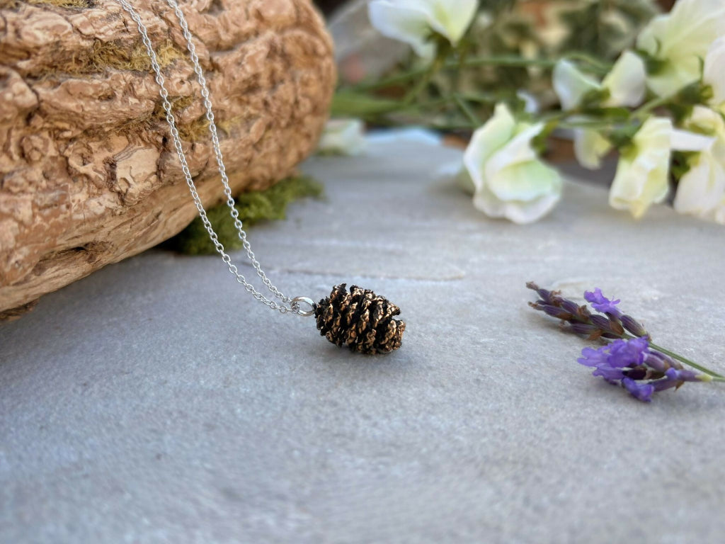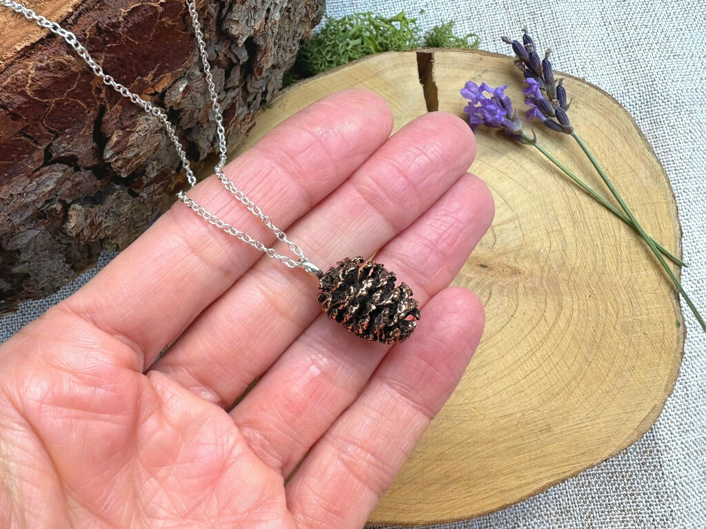 The enchanting Pink Bronze Pinecone Necklace is inspired by the beauty of woodland treasures. Handcrafted from an actual miniature alder cone, each piece is cast in a blend of copper and bronze, capturing the warm pink tones of copper alongside the strength and durability of bronze.