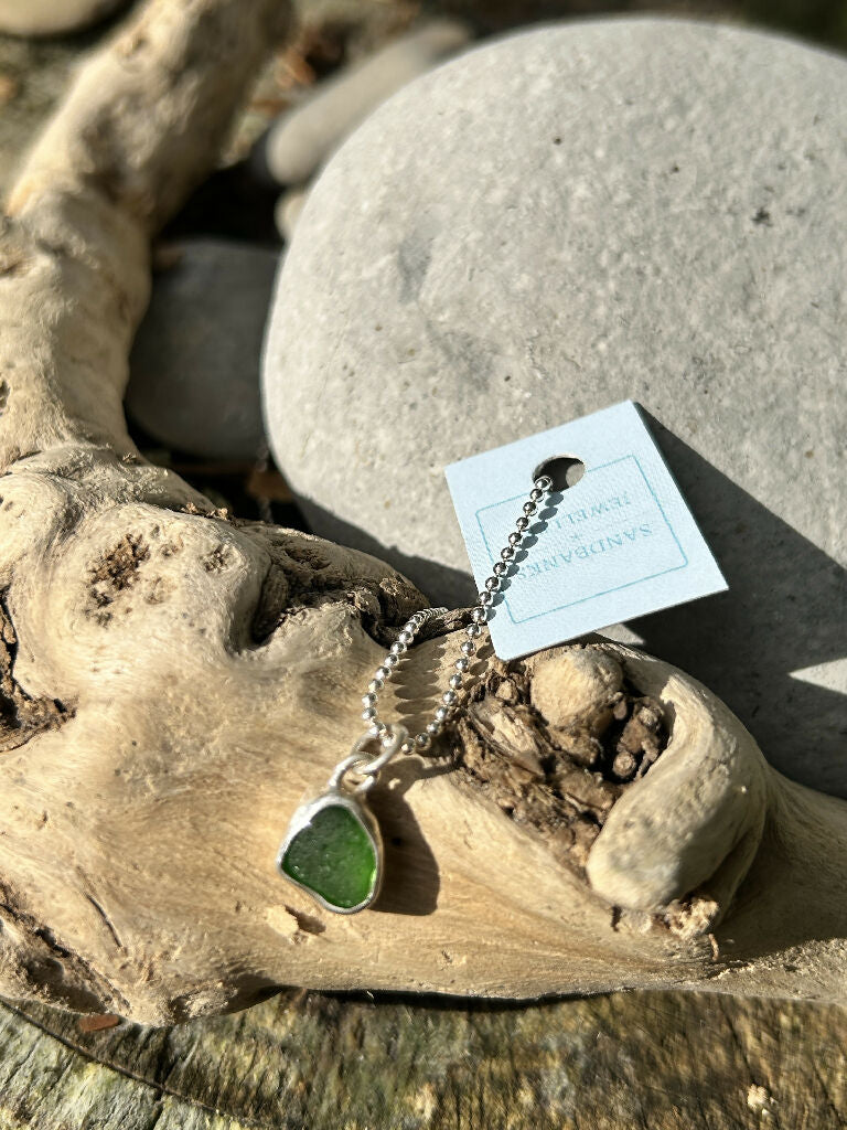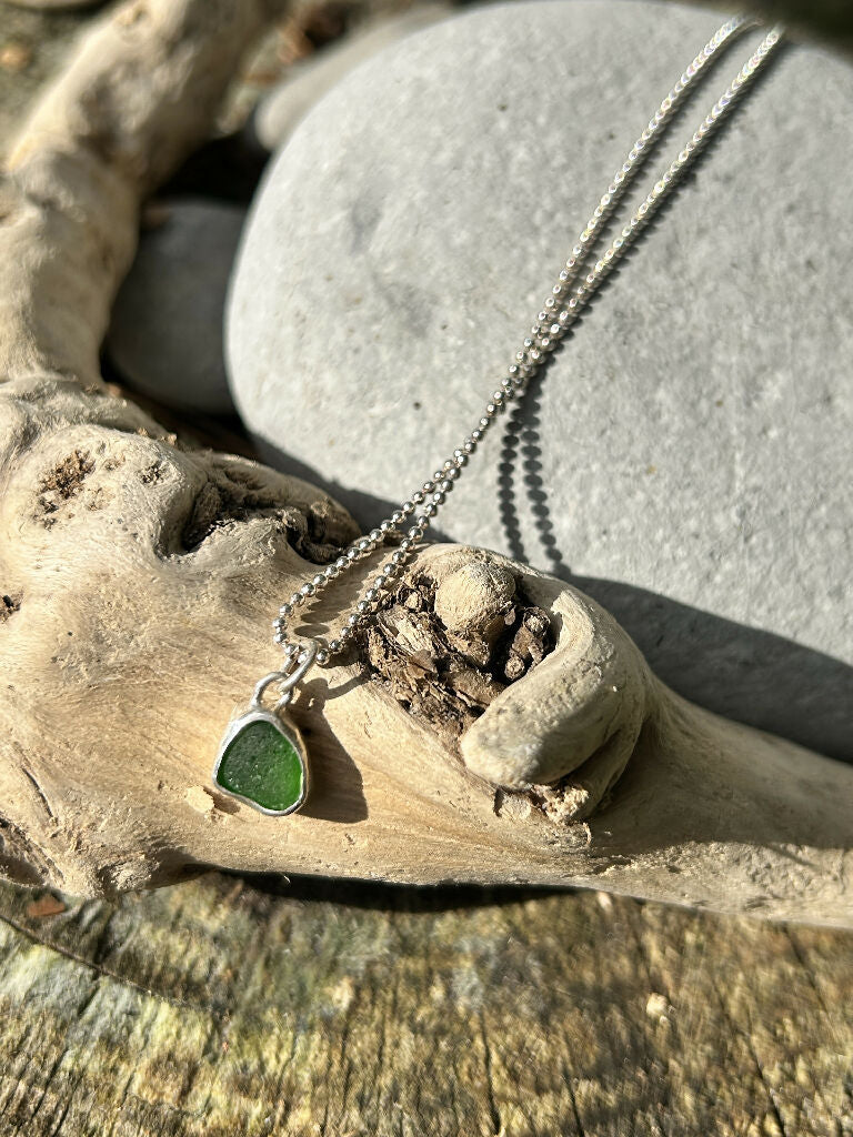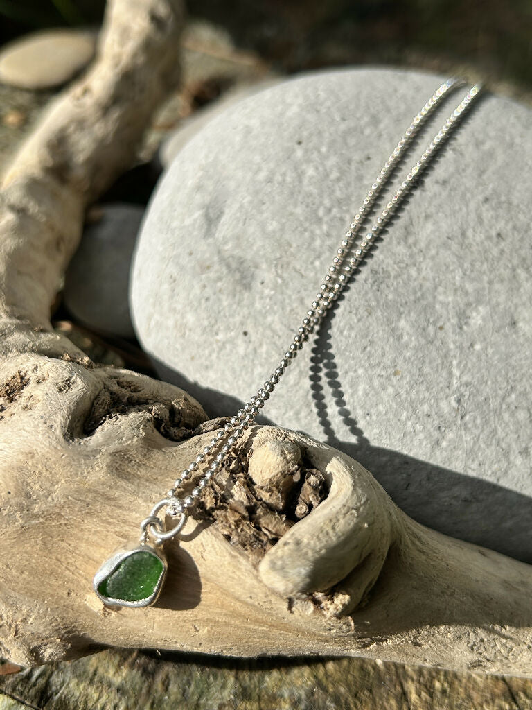 Green Seaglass and silver pendant necklace featuring a lovely colour green Seaglass.The seaglass is wrapped with recycled silver. A rare find.