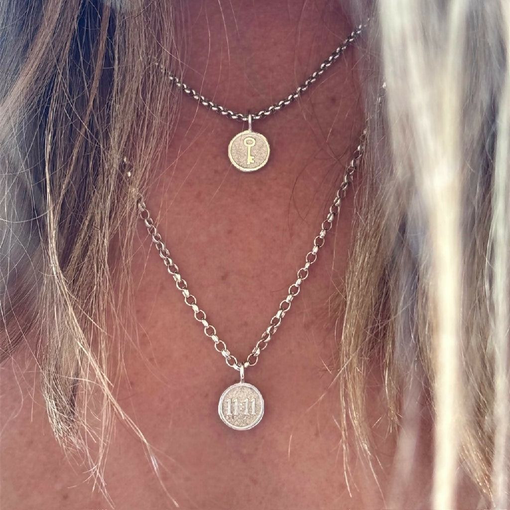 Unlock your next chapter with our sterling silver Key charm necklace - a timeless piece designed to inspire freedom, opportunity, and strength. This elegant necklace features a finely detailed key charm set against a textured background, creating a subtle sparkle that catches the light beautifully.
