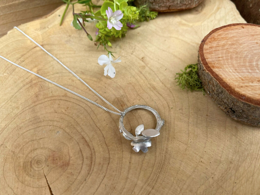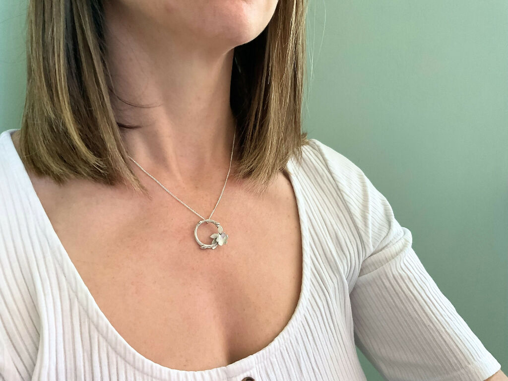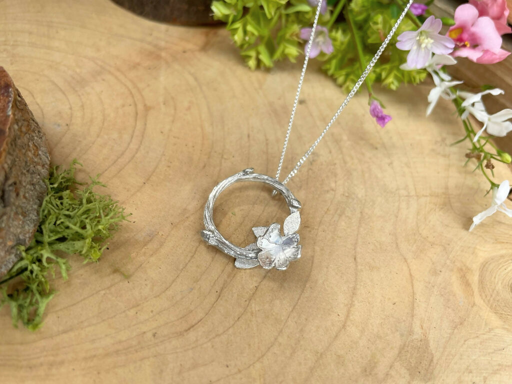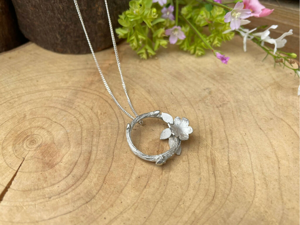 Celebrate the beauty of nature with this handcrafted necklace, inspired by a tree in bloom. The circular pendant is cast from a real twig and finished with three frosted silver leaves and a delicate blossom flower, creating a true representation of nature.