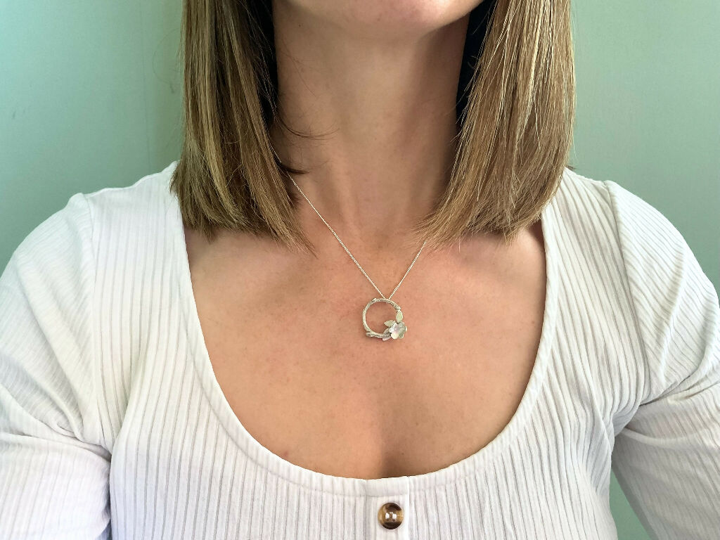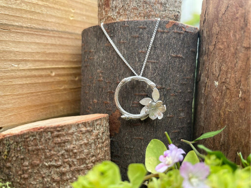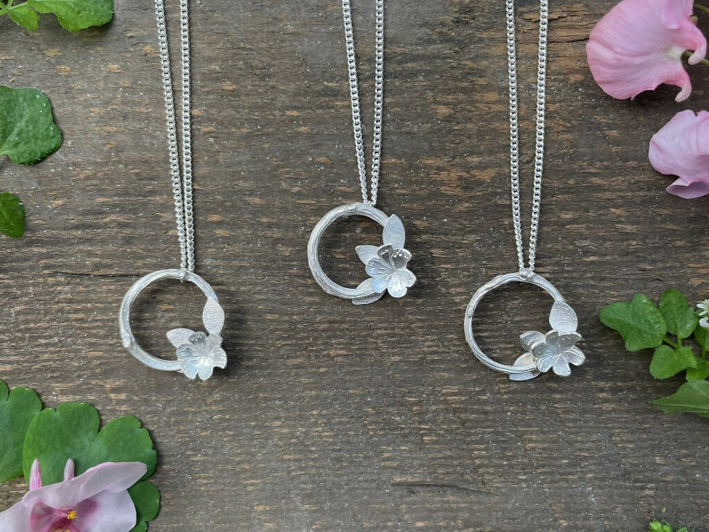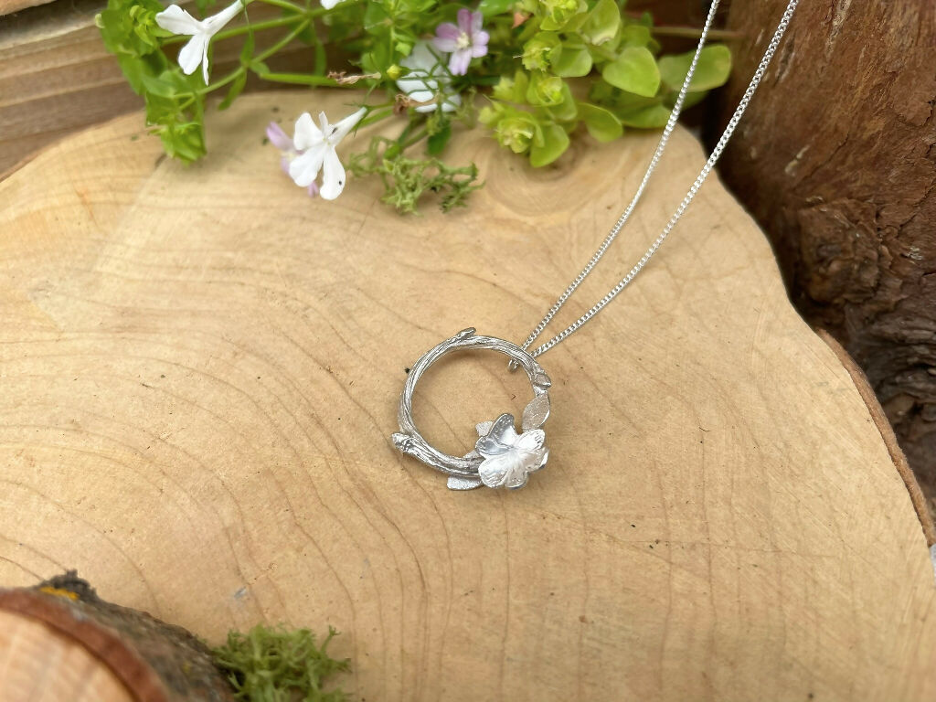 Celebrate the beauty of nature with this handcrafted necklace, inspired by a tree in bloom. The circular pendant is cast from a real twig and finished with three frosted silver leaves and a delicate blossom flower, creating a true representation of nature.