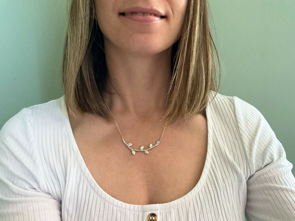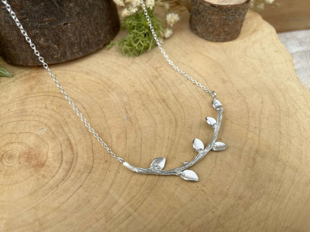 Each branch is cast from an actual twig in solid 925 Sterling Silver and finished with tiny, frosted leaves for a delicate, contemporary look. The twig curves beautifully along the neckline and is suspended from a silver curb chain.